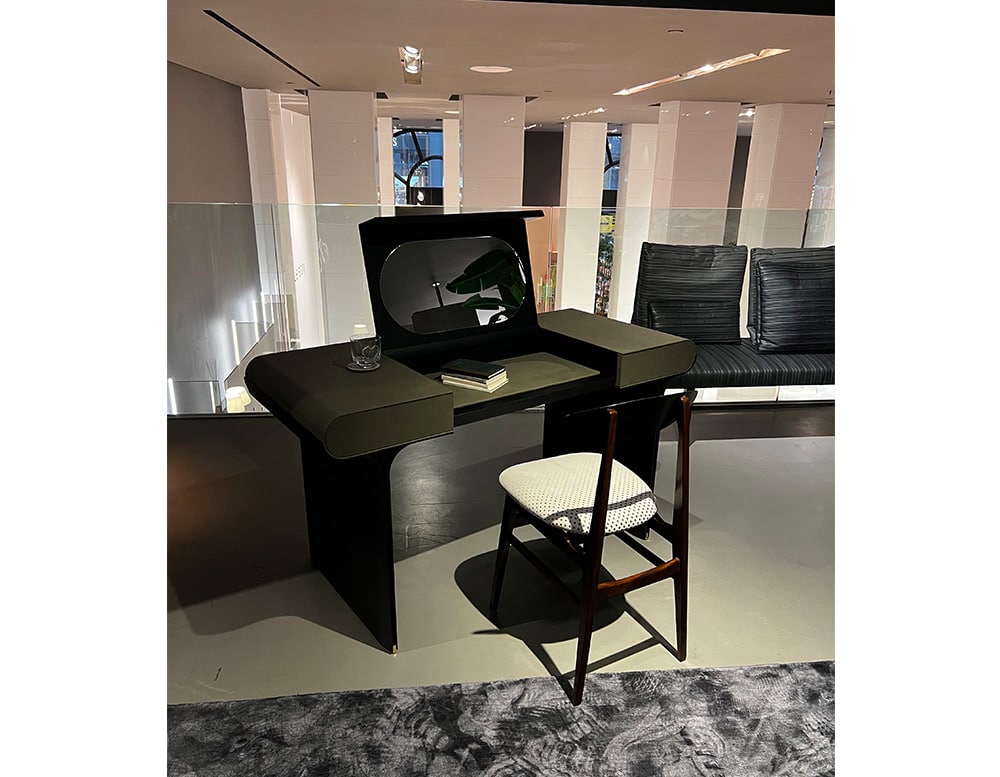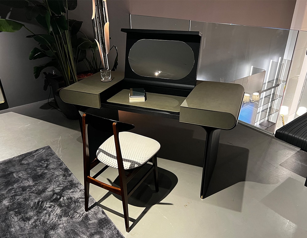 Desk and vanity desk with curved black open pore stained ash base and bright brass details. Wooden structure covered by leather. Black open pore stained wooden opening top and internal compartment equipped with leather coordinated with the external upholstery. Opening top with magnetic board (desk) or with mirror (vanity).