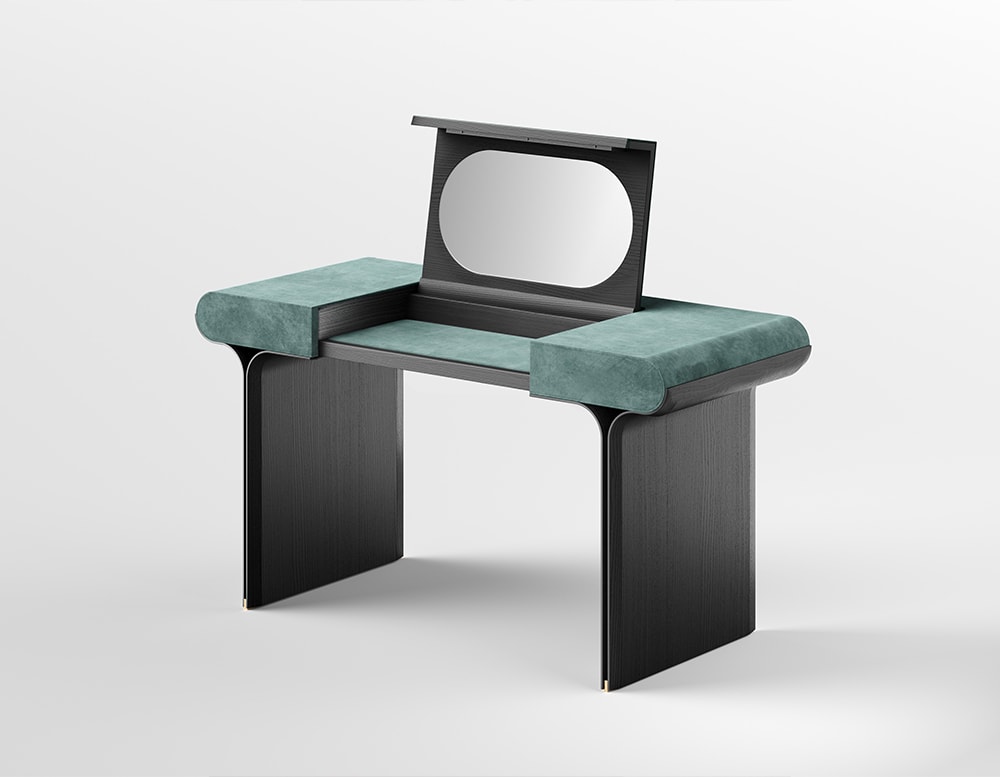 The vanity desk features a curved black open pore-stained ash base and bright brass details. Wooden structure covered by leather or suede as per samples. Black open pore stained wooden opening top and internal compartment equipped with leather or suede pad coordinated with the external upholstery.