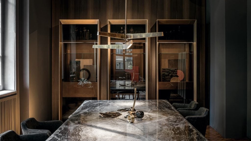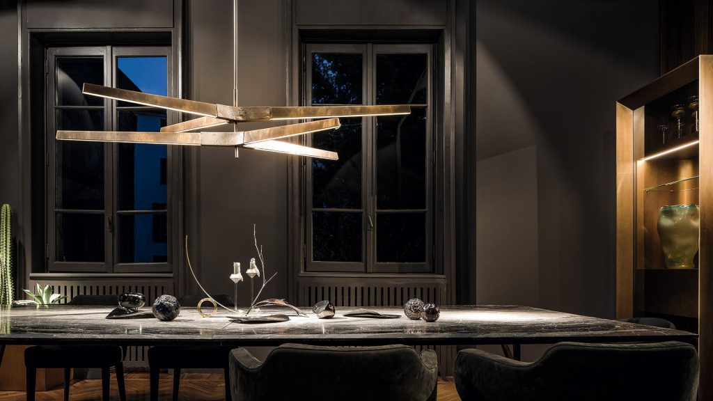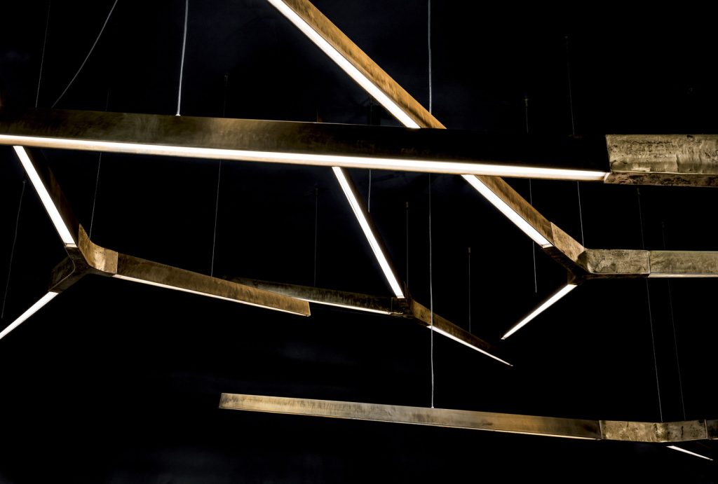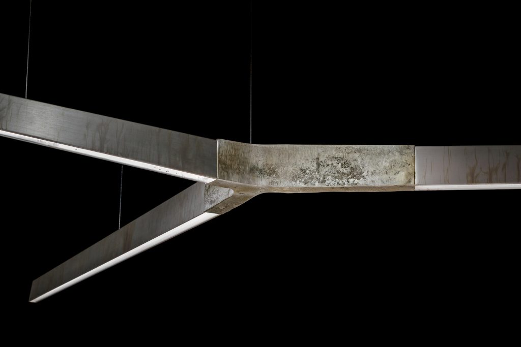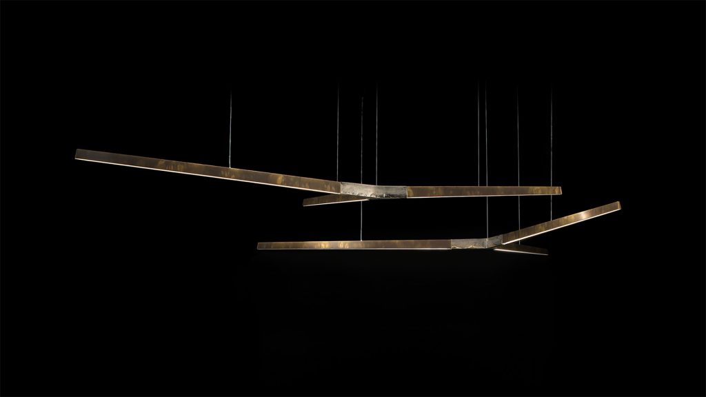 Dimmable pendant energy saving led lamp with y-shaped central body sandcasting brass, sandcasting bronze or sandcasting brass silver finisher. Lighting body in burnished brass, black burnished brass, h-silver. Transformer incorporated in the ceiling rosette (ø cm 22x6h).