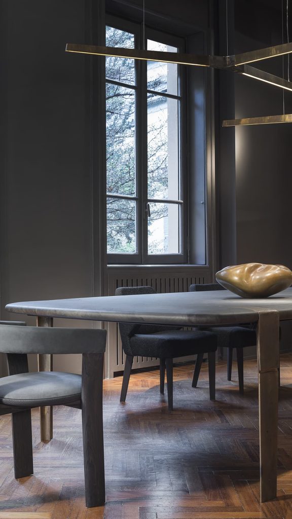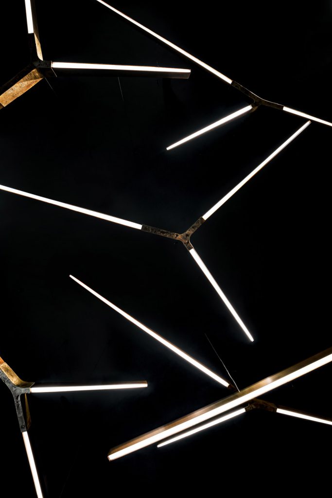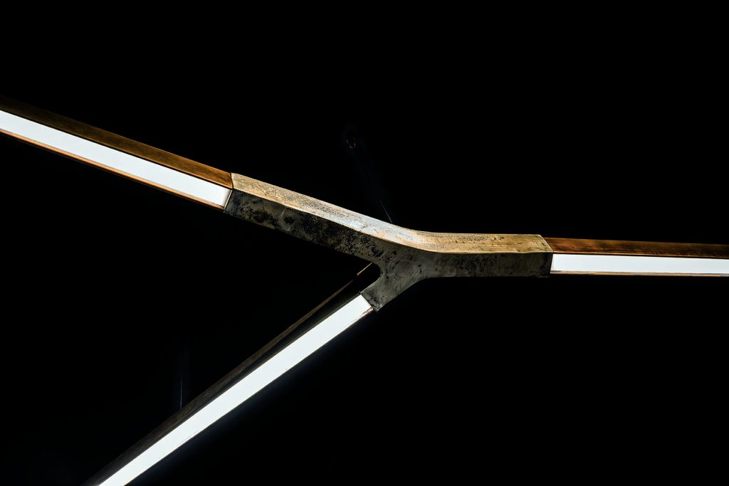 Dimmable pendant energy saving led lamp (Energy efficiency index A) with Y-shaped central body sandcasting brass, sandcasting bronze or sandcasting Silver. Lighting body in burnished brass, black burnished brass, H-Silver. Low voltage power supply cable through suspension cable. Transformer incorporated in the ceiling rosette. Available alternative fixing system for lamp with remote transformer. Available extra warm light 2700K. Only for indoor use. Dimmable push button. Other dimming systems available upon request. Standard overall height 180 cm.