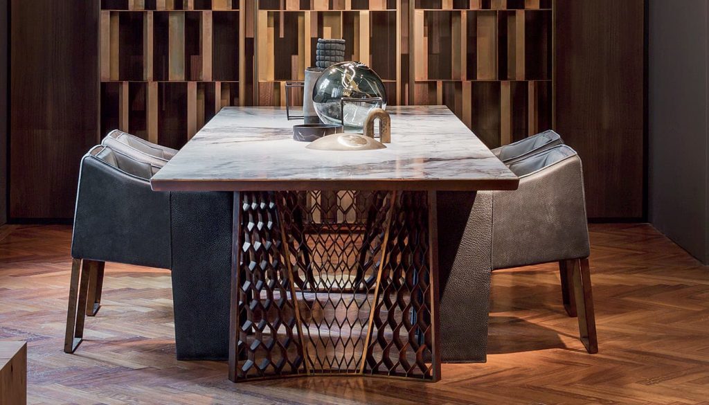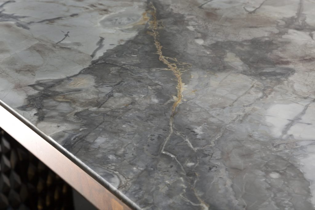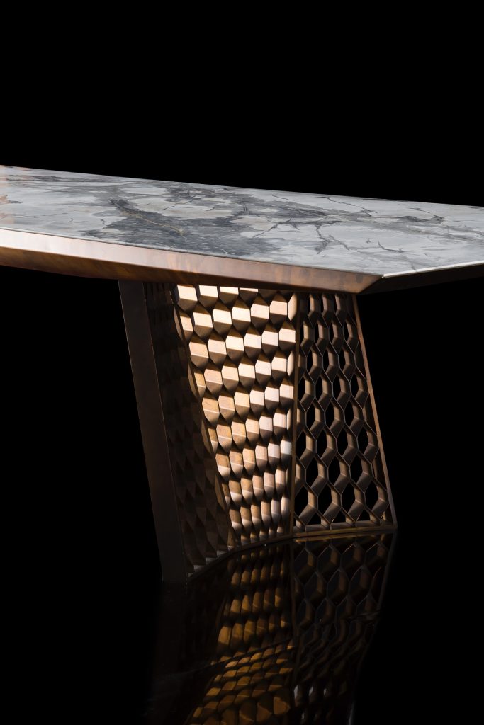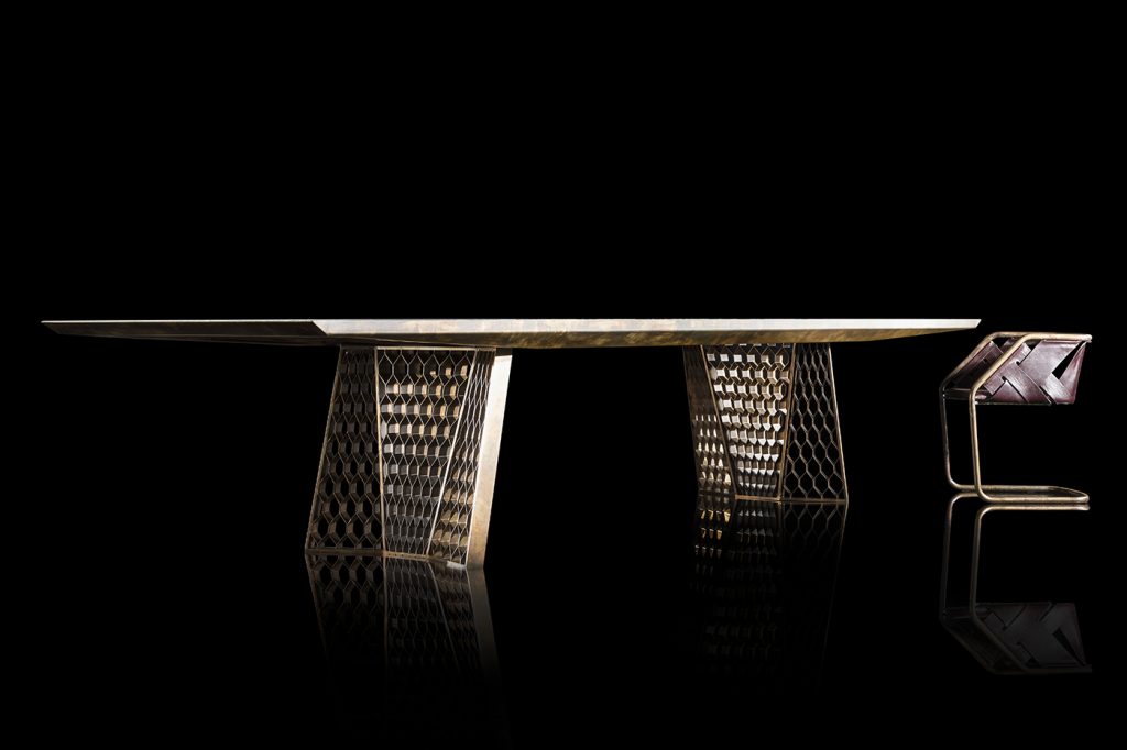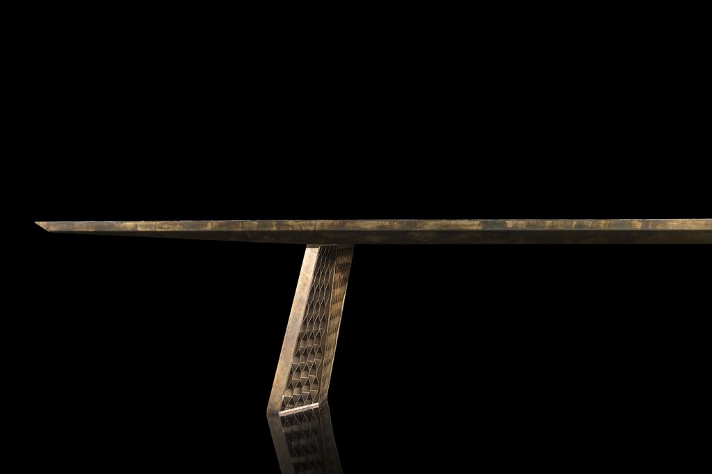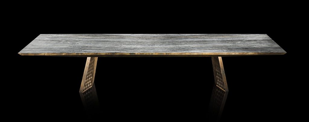 Structure legs, frame and structure in steel burnished by hand brass finish using traditional techniques. - Top heat treated woods as our samples, swamp oak, stoneelm® oil finish based on natural wax and water. Marble stones and granites as per our samples.