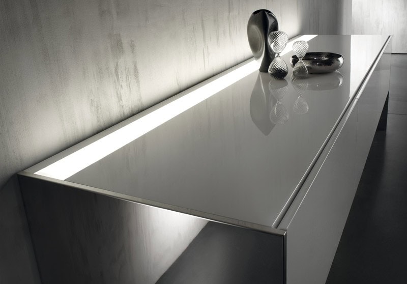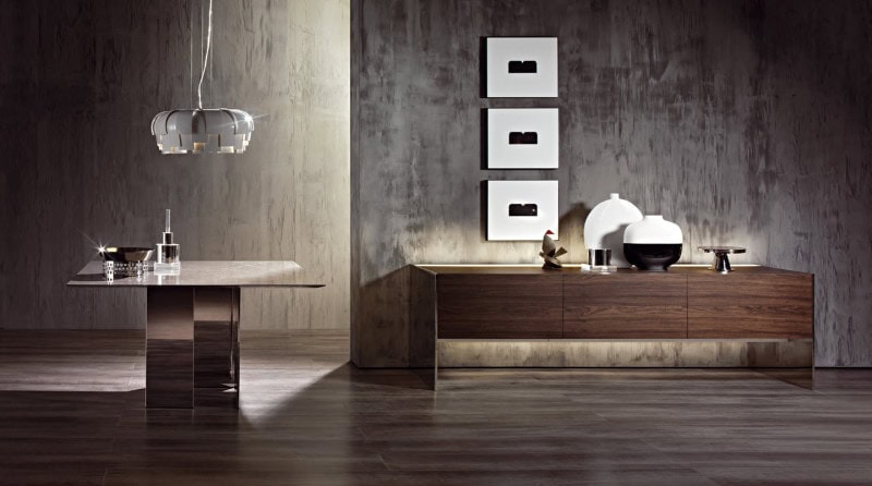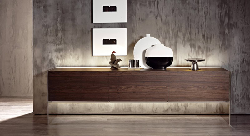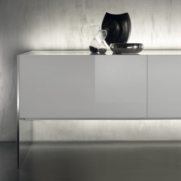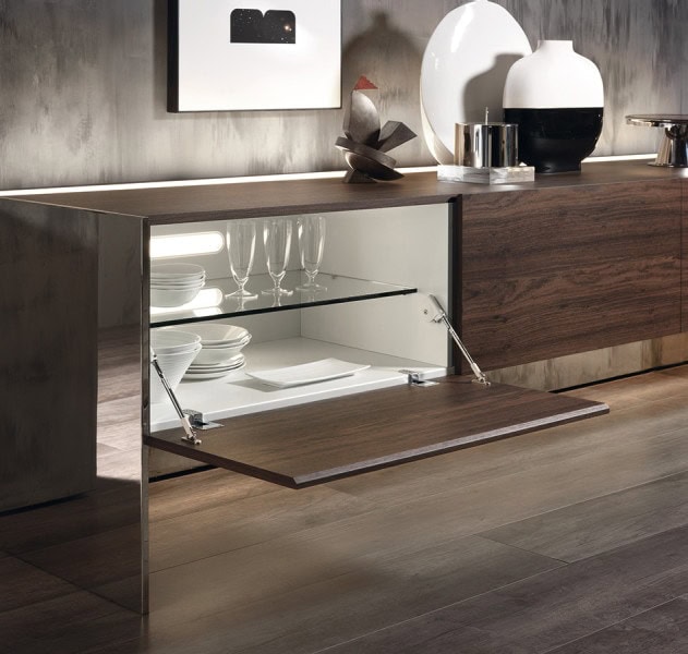 Particularly wide sideboard supported by two thin and precious sides in mirror polished steel. Featured by a lighting system, placed in a rear technical channel, it allows the light to come at the same time from the upper part, the lower part and inside the casings. A thick wooden back panel makes the unit a free standing sideboard. With flap doors, variously fitted inside with shelves and drawers.