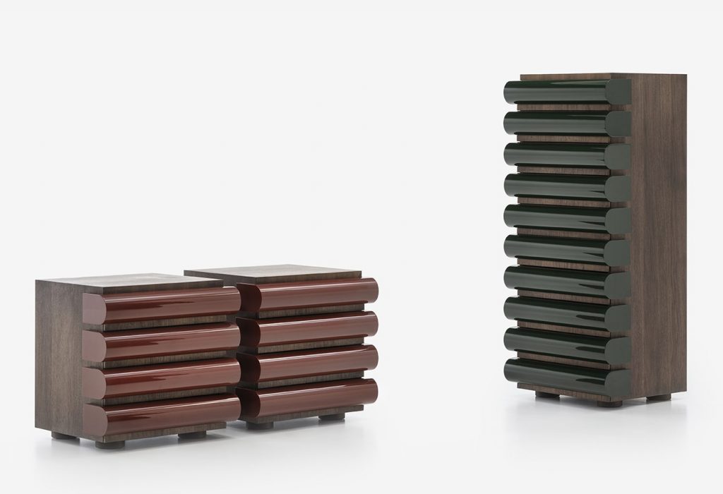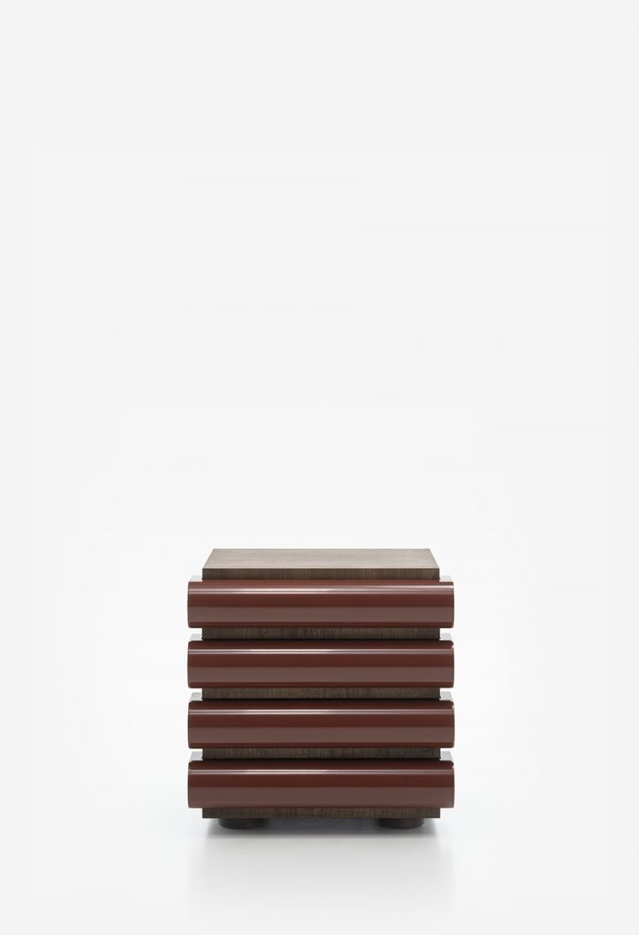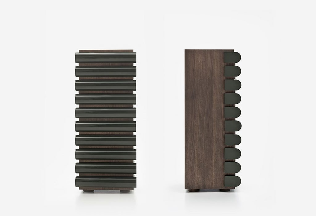 A playful, spirited pillar of drawers, the Storet cabinet epitomizes the visionary touch of Nanda Vigòs designs, now modernized with a brightly lacquered wood contrast and brand new proportions. In both its elongated vertical edition, and in the nightstand designed by Vigo but manufactured for the first time only now, the Storet reflects today's advances in production, with the walnut's visible grain illuminating Acerbis's modern expertise in utilizing extensive wood surfaces. The cabinet, though made entirely of a single material, creates a potent game of color play, tempered by the pacifying shades and the natural quality of the wood.