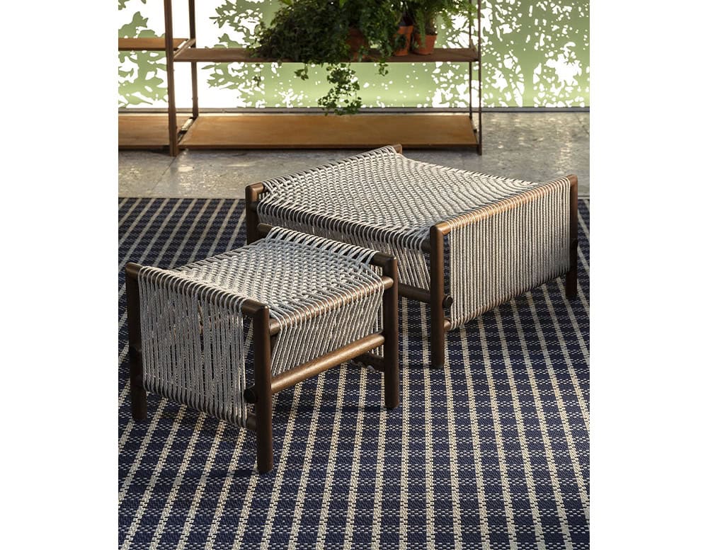 Three String Poufs. Blue cushions and natural wooden structure in a living room.