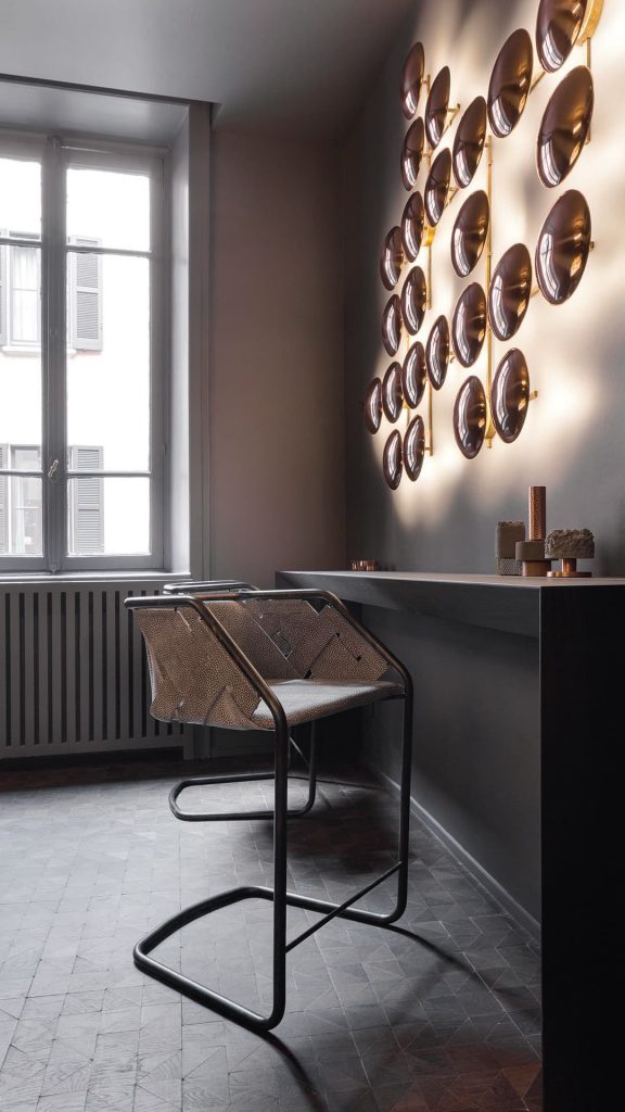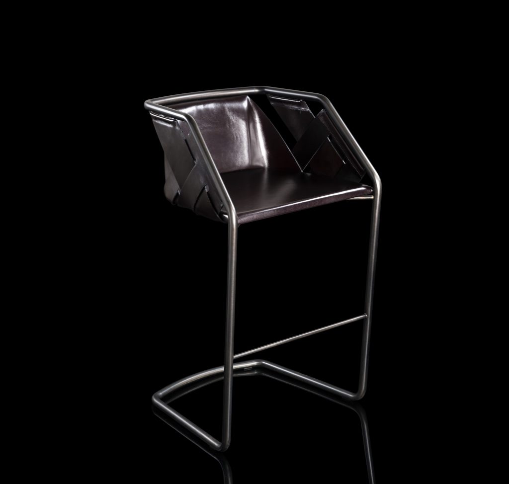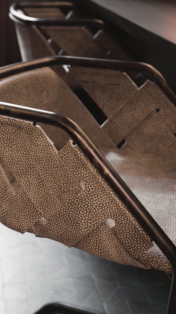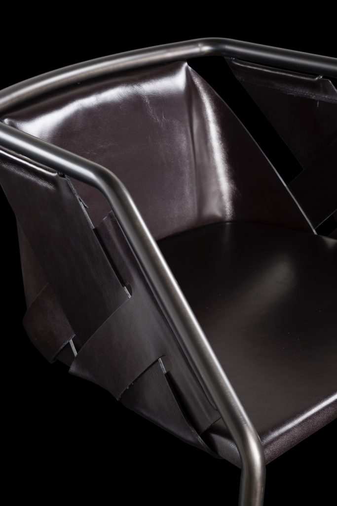 Structure in heavy duty curved metal pipe frame. Seat covered with leather nabuck, camoscio, e-type, durango. - Structure finishes: hand burnished metals using traditional techniques, result of an exclusive henge recipe: - black burnished steel - burnished brass - black burnished brass
