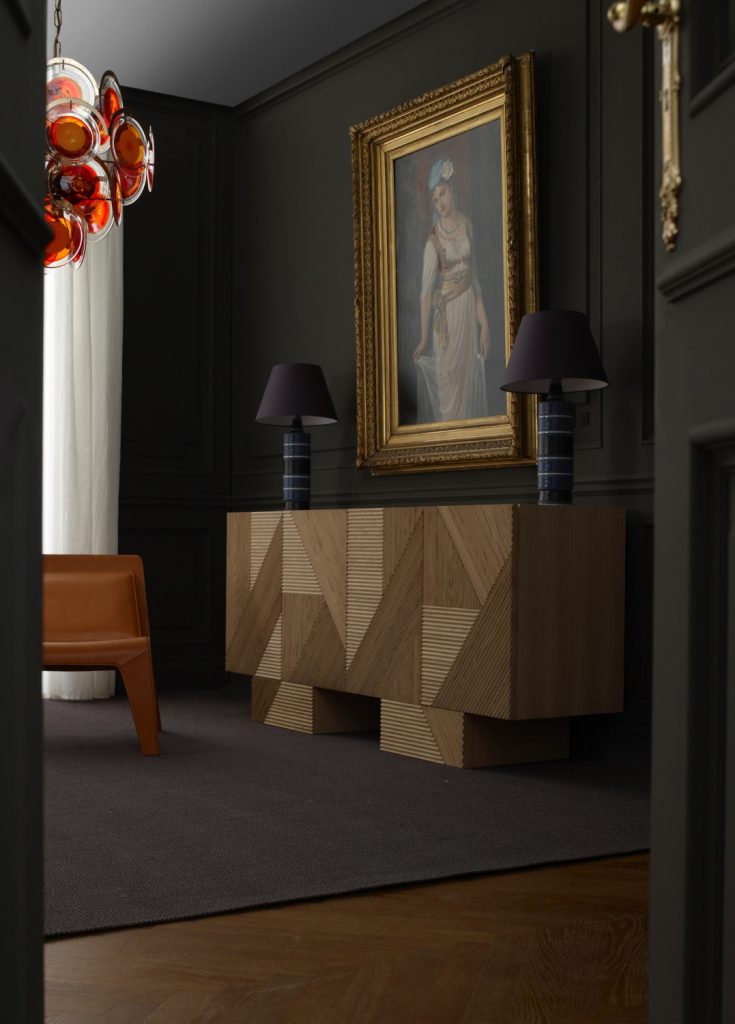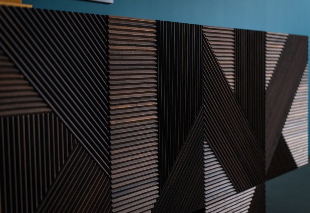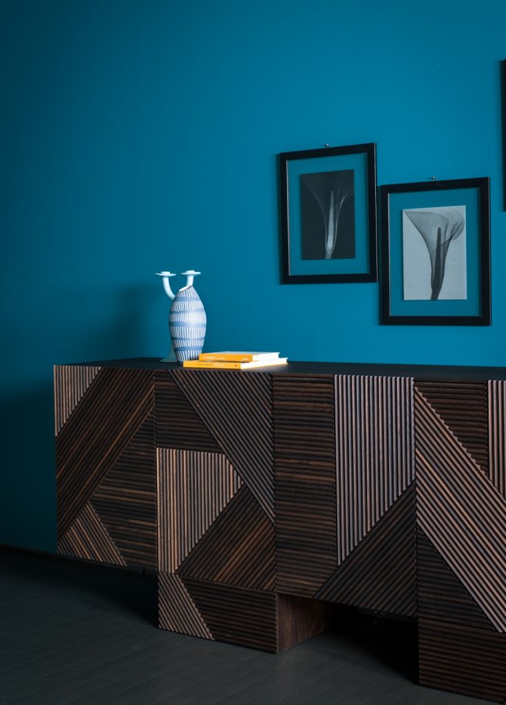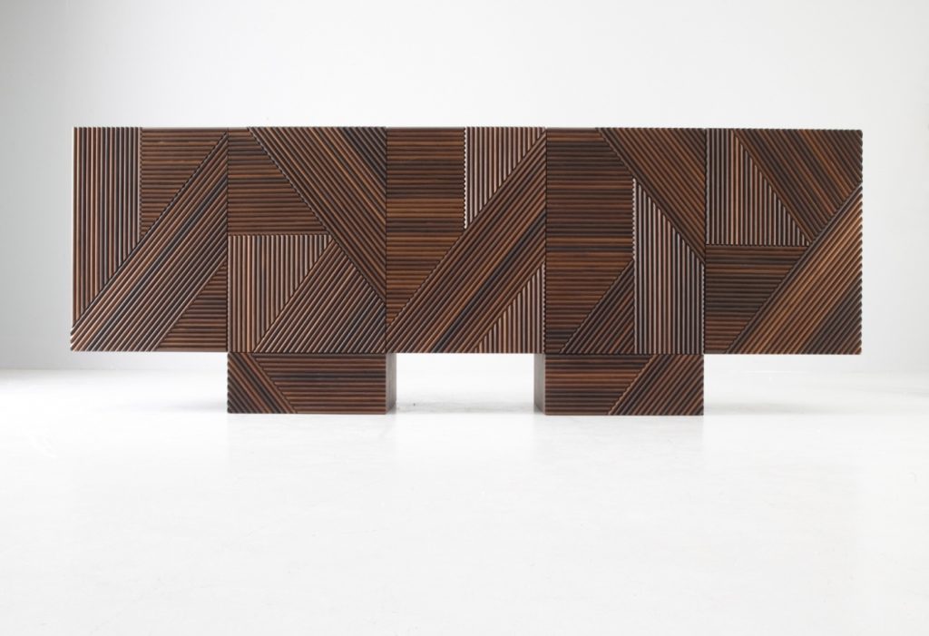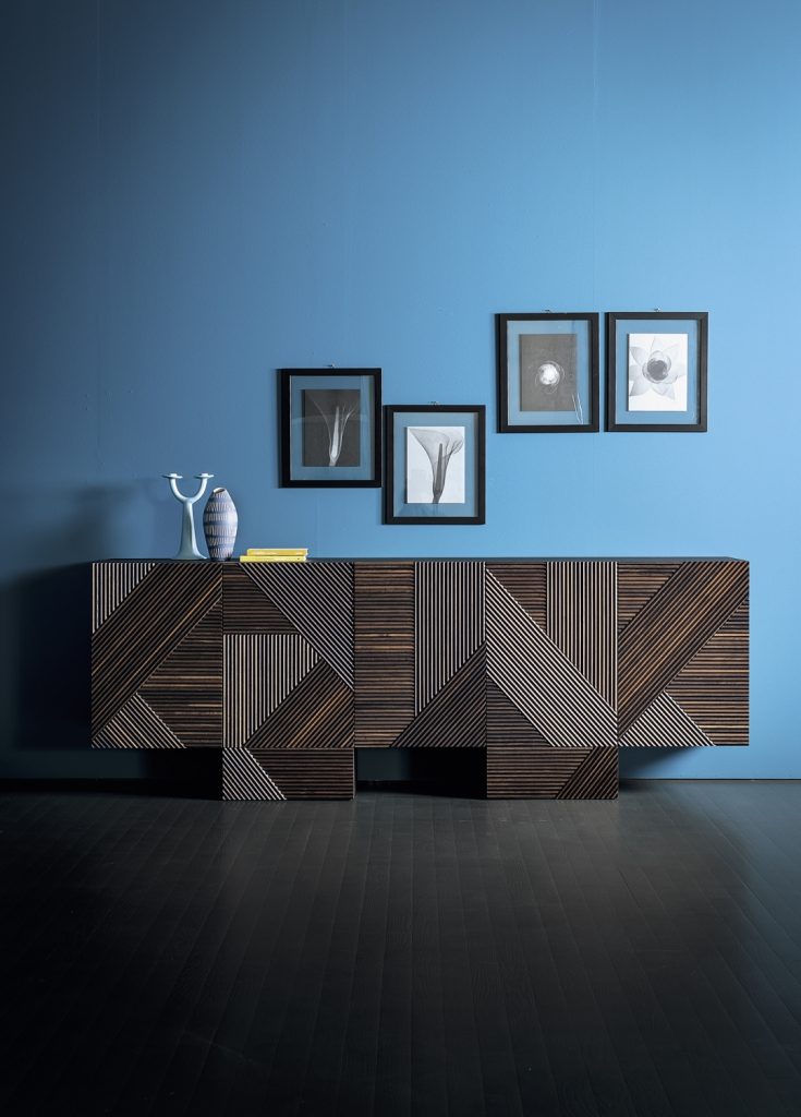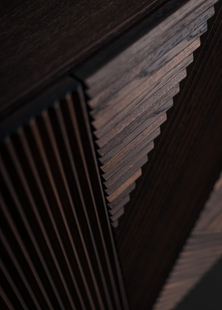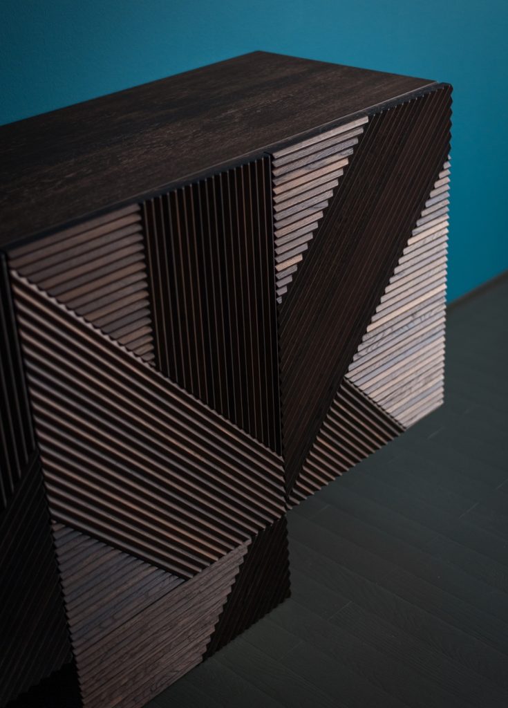 Series of storage units, chest of drawers and bedside tables characterized by the facade decorated by triangular profiles in solid wood, singly hand-applied to create an asymmetrical design. Structure made of veneered panels. The base follows the doors' pattern. Spaces equipped with 2 inner shelves in extra-white tempered glass each.