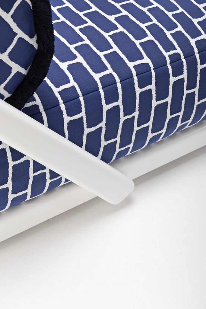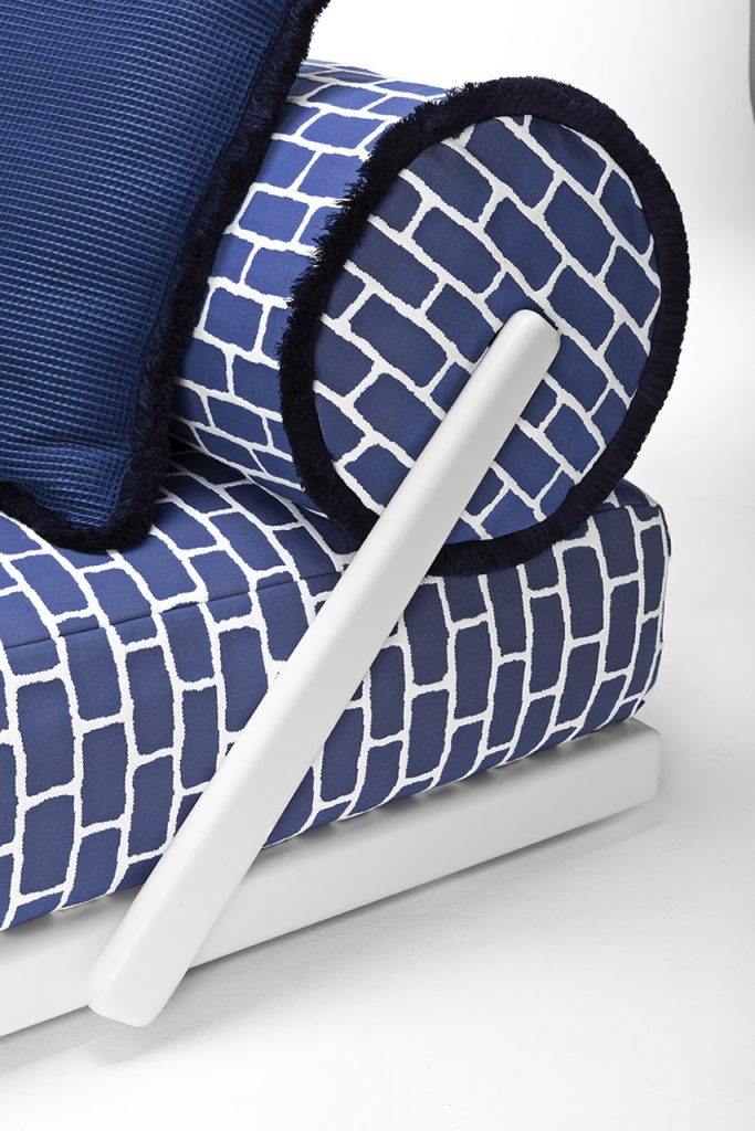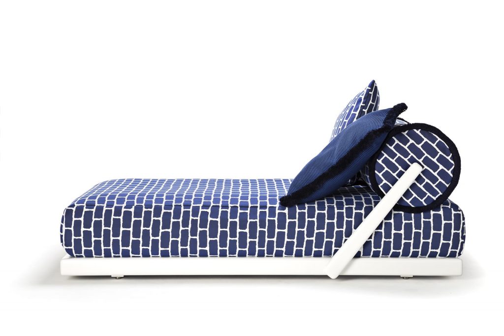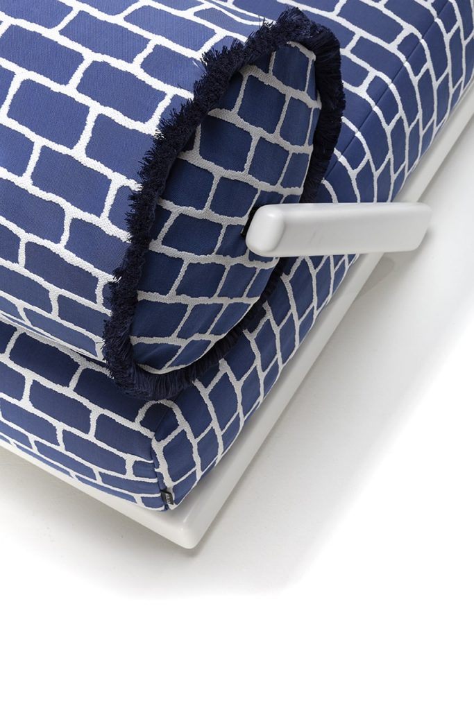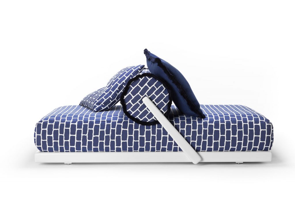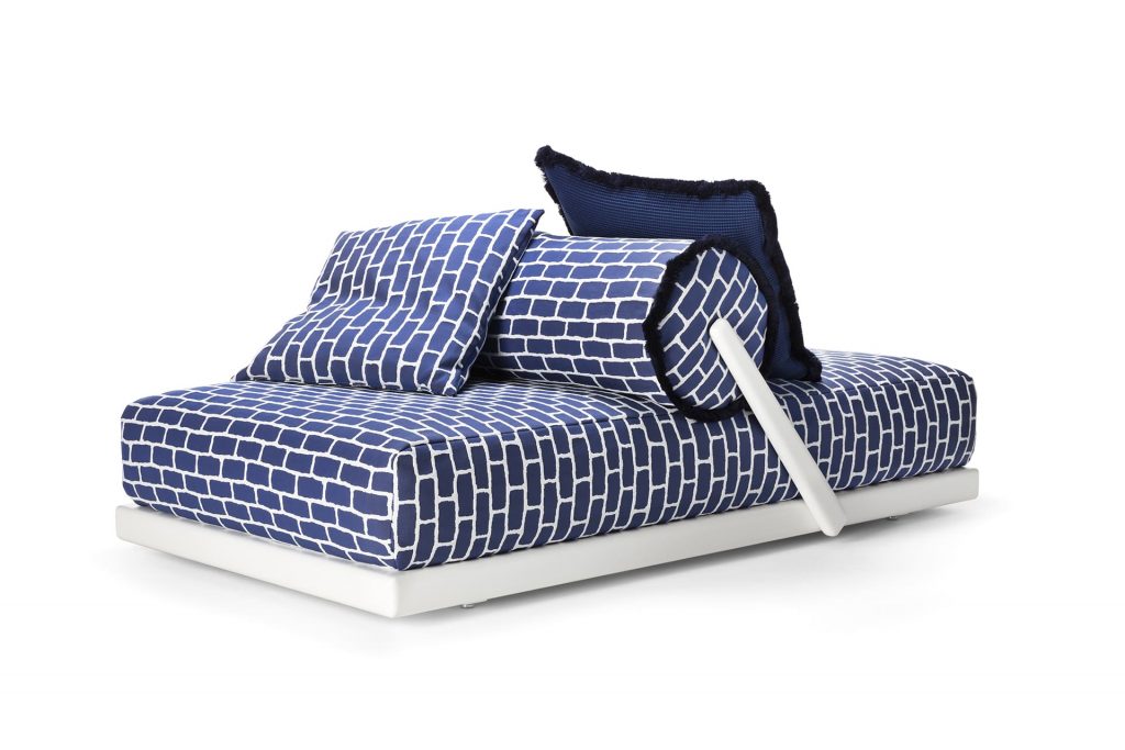 Sunset Roll Bed is not afraid to change its features according to the space and the moment. The rolling pillow turns the sun lounger into a chair for two divided by the armrest.