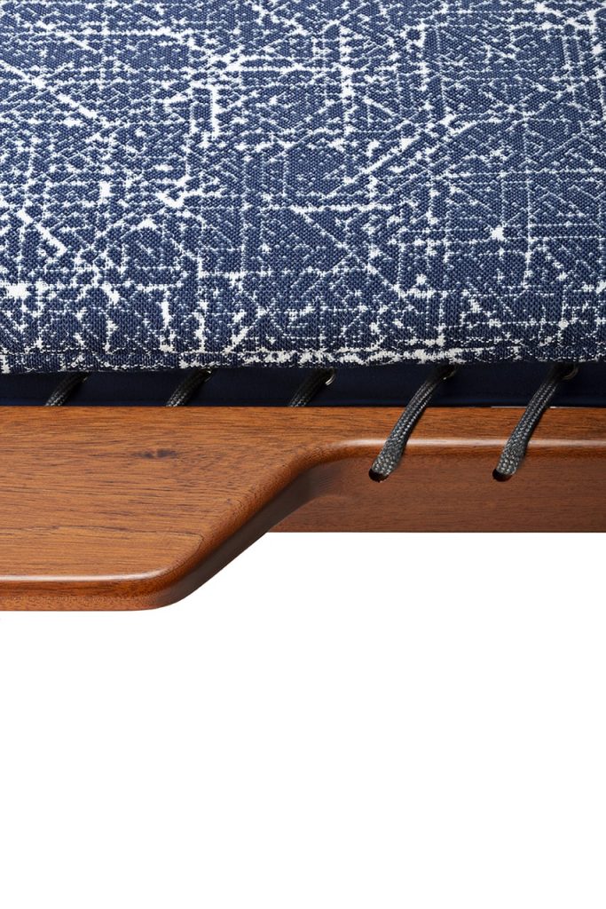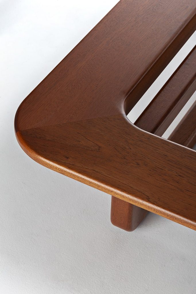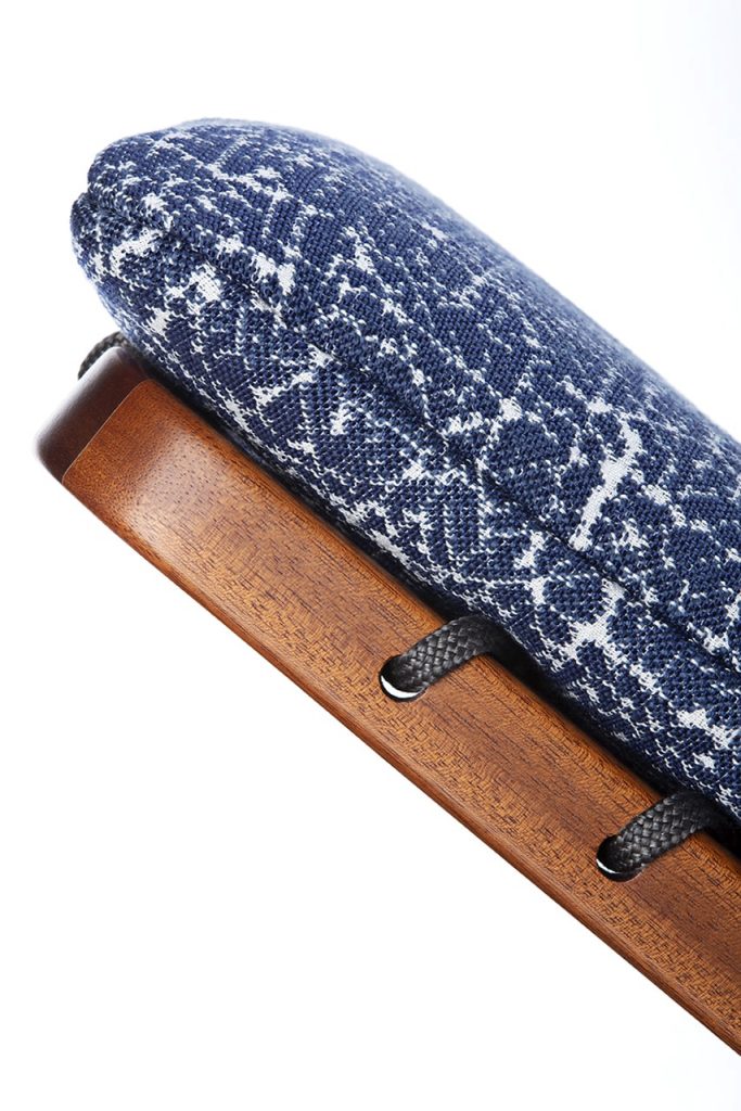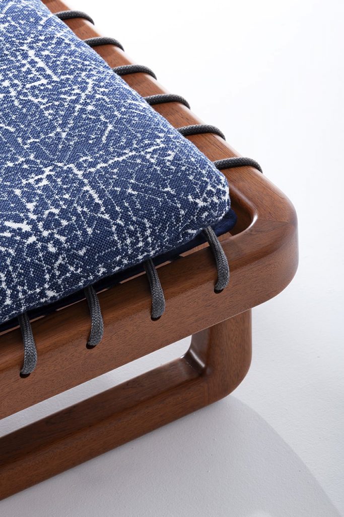 The polished structure in Sapelli mahogany emphasizes the differences of the elements. The wood finish remarkably matches the soft padding.