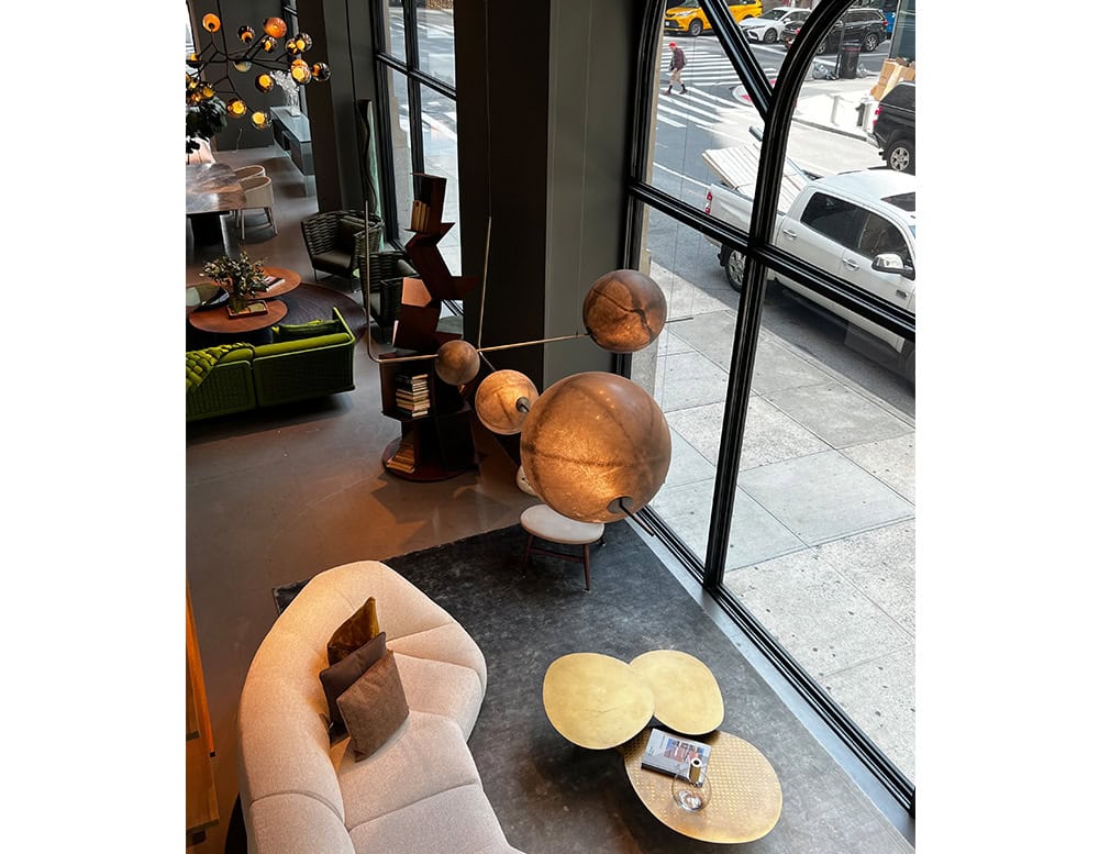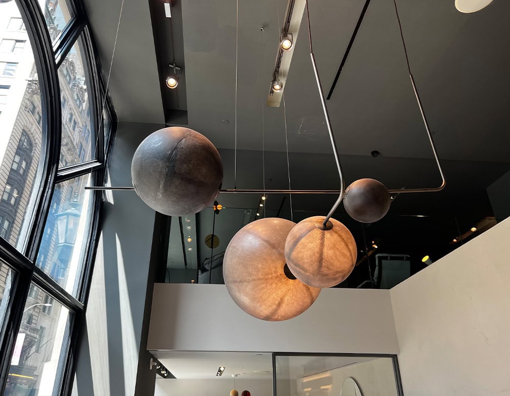 Suspension light with lighting body in gray fiberglass, finish in burnished steel. Standard overall height is 111".