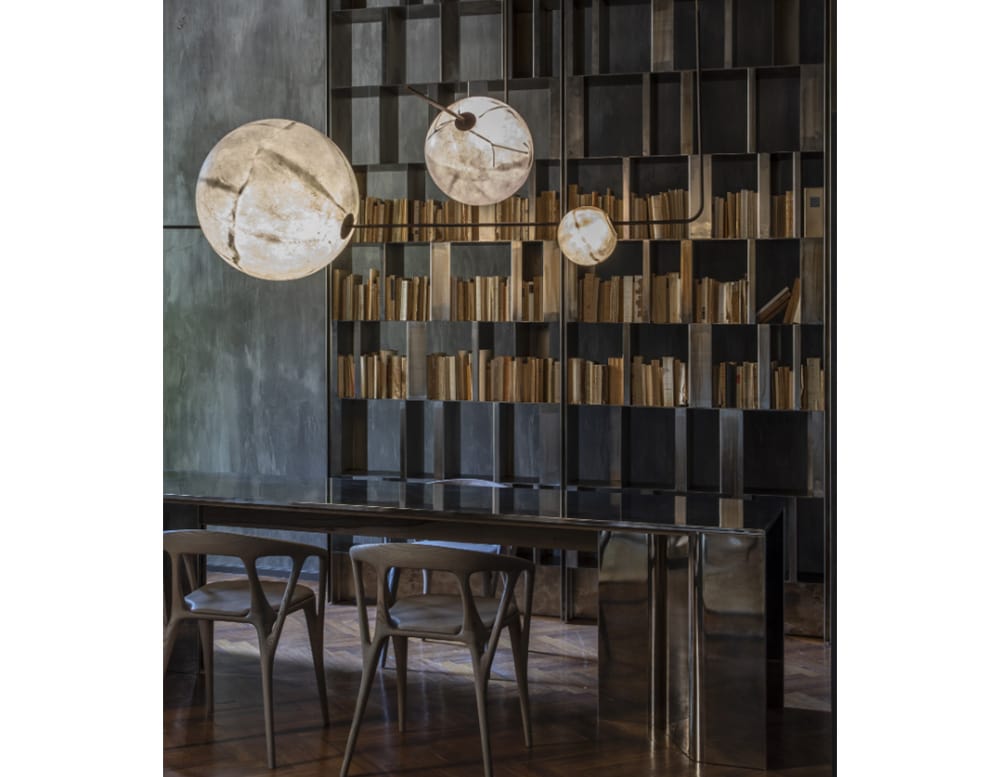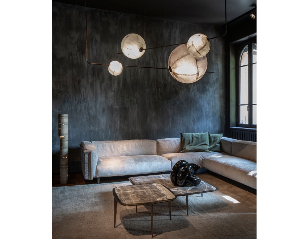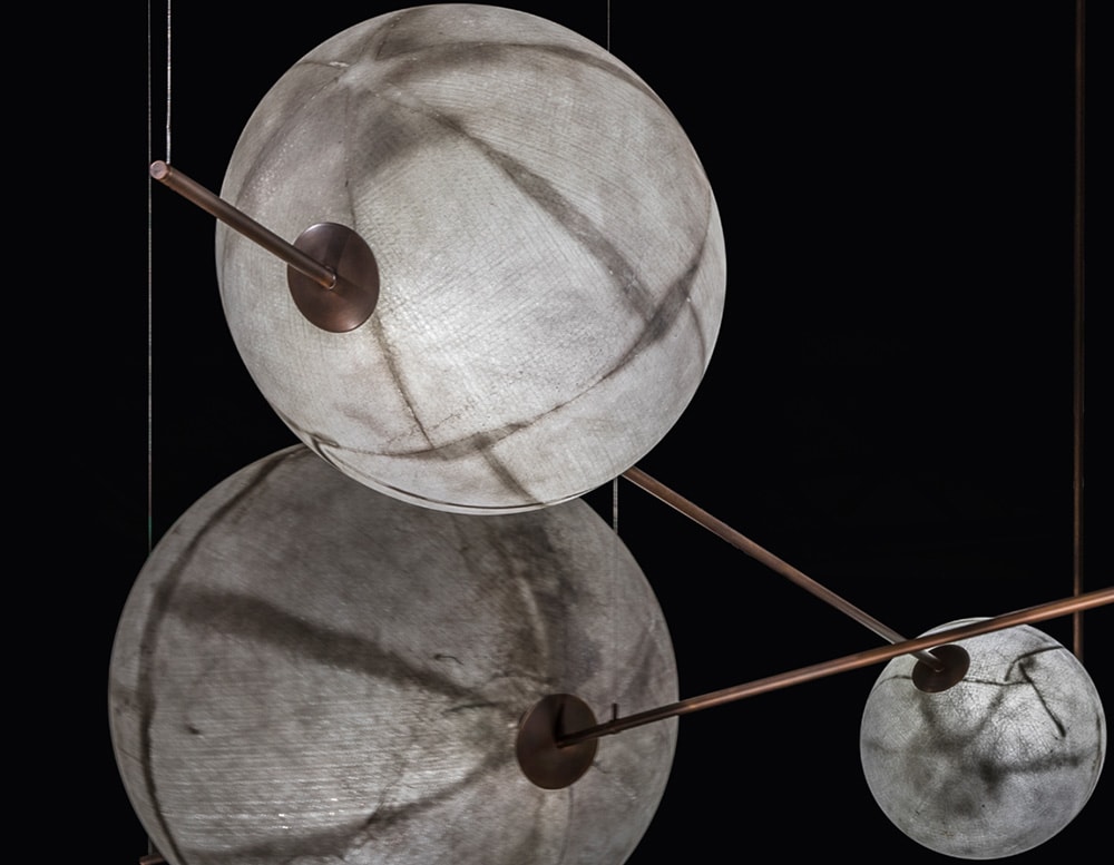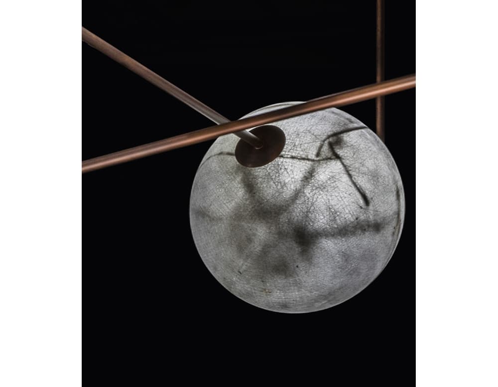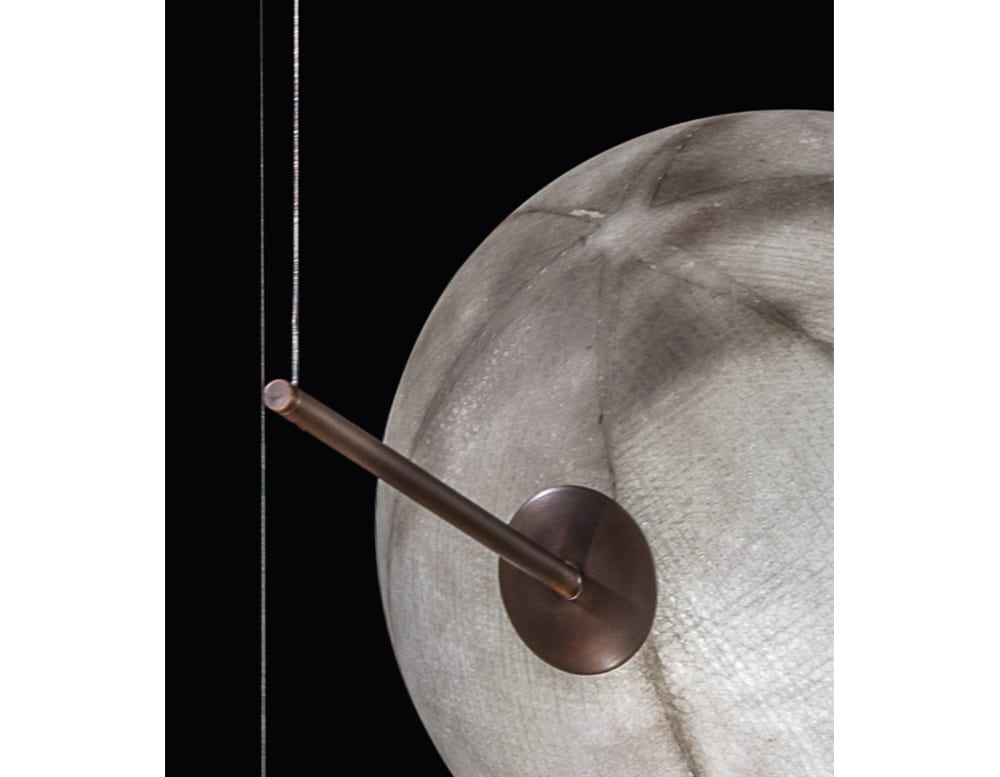 Spherical pendant lights made with with grey fiberglass available in different sizes.
