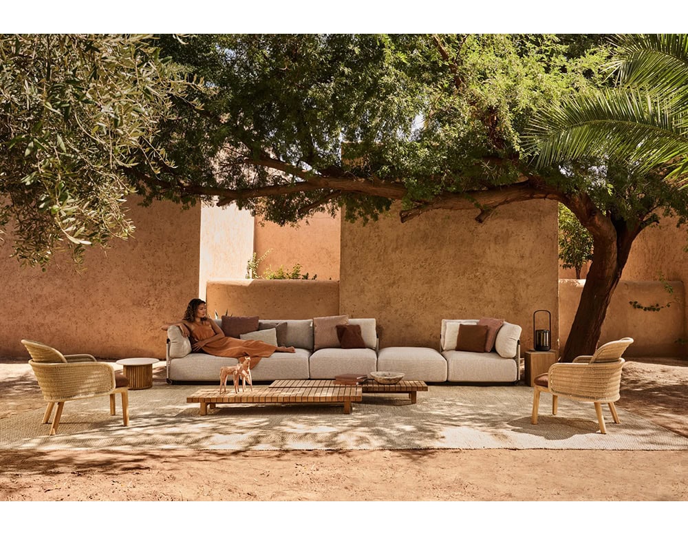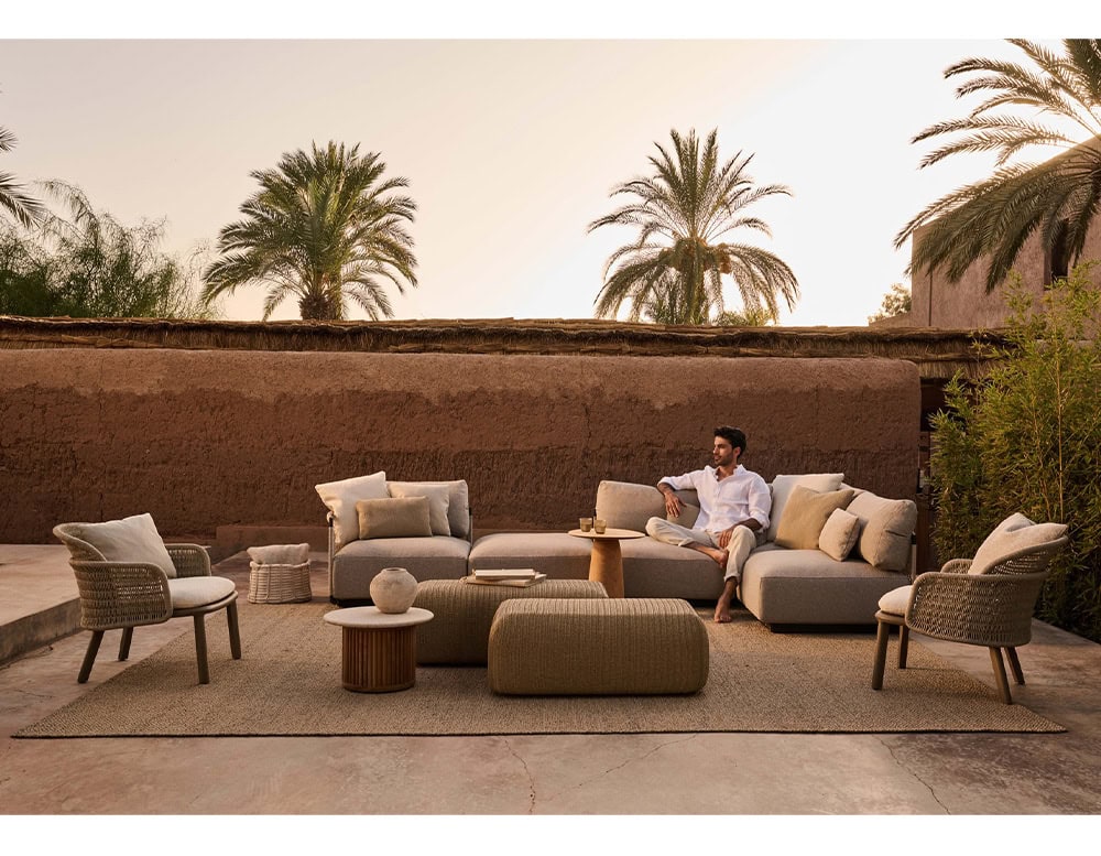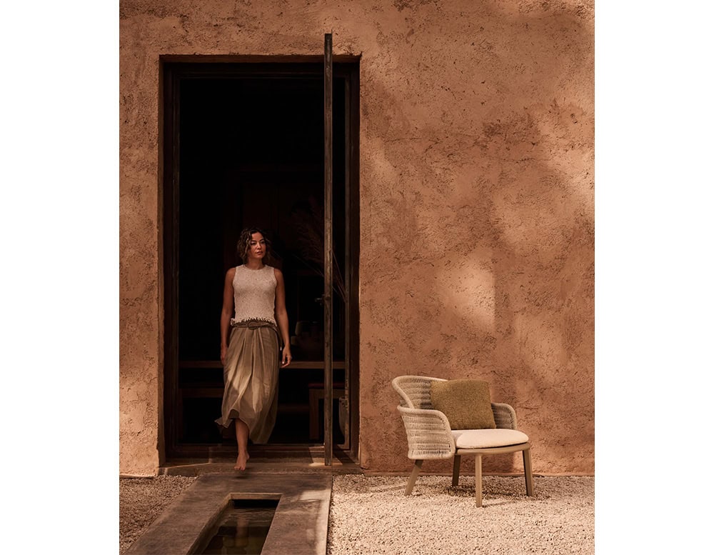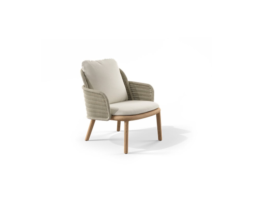 The Suro lounge chair truly enhances the combination of two materials: the elegant rigor of teak wood or powder coated aluminium and the flexibility of the braided rope weaving. Both materials elegantly blend into an exceptional design. The wood and aluminium both affirm the structure of the seat. The fiber backrest, as if hanging from the seat, forms an embracing cocoon-like flower petal which provides unique comfort thanks to its roundness.