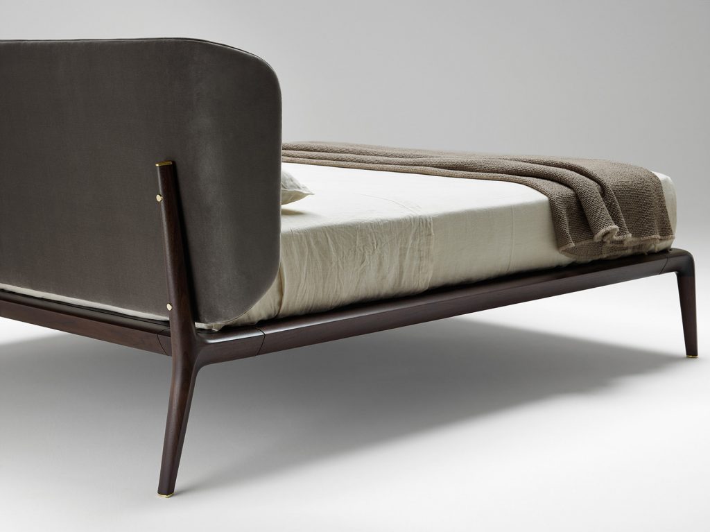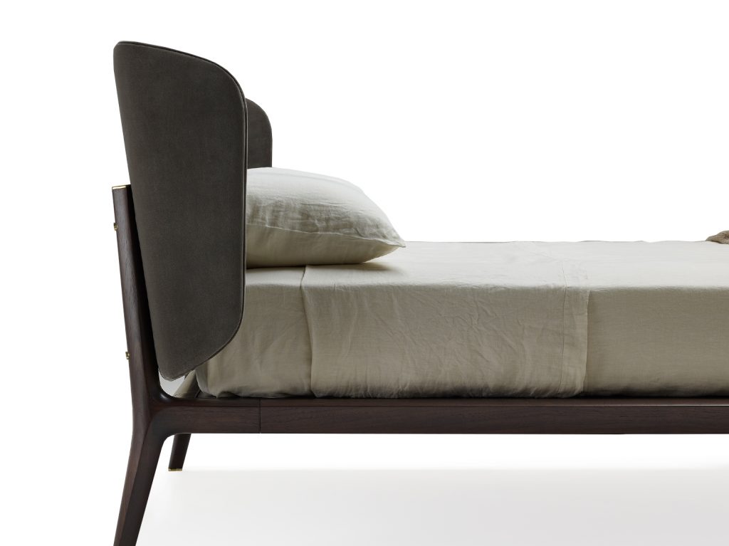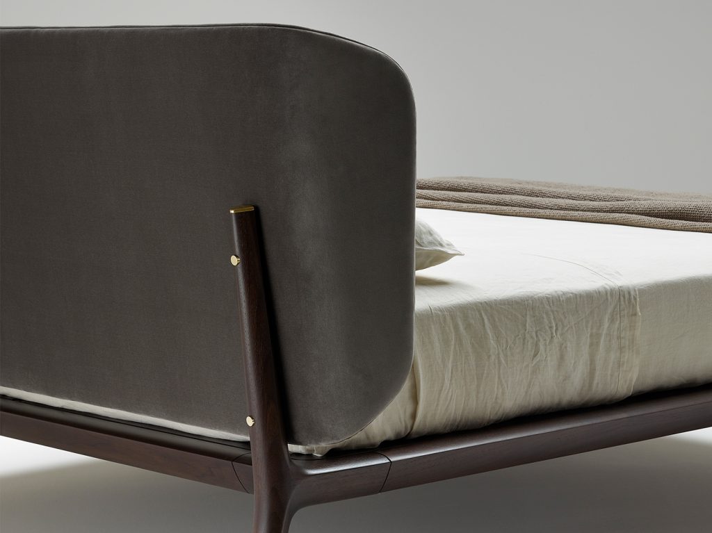 Bed in solid american walnut, bed base in veneered plywood, upholstered headboard.