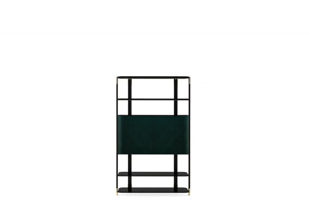 Shelving system with black anodized aluminium supports with bright brass details. 8mm tempered shaped smoked "grigio Italia" glass shelves painted bright black. Wooden glossy lacquered door, flap door or drawer units in the artisanal and exclusive finish Prussian Blue. Black open pore lacquered ash interior.