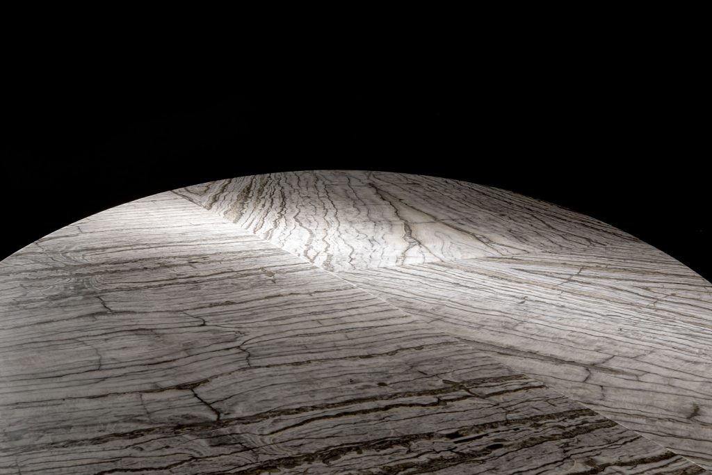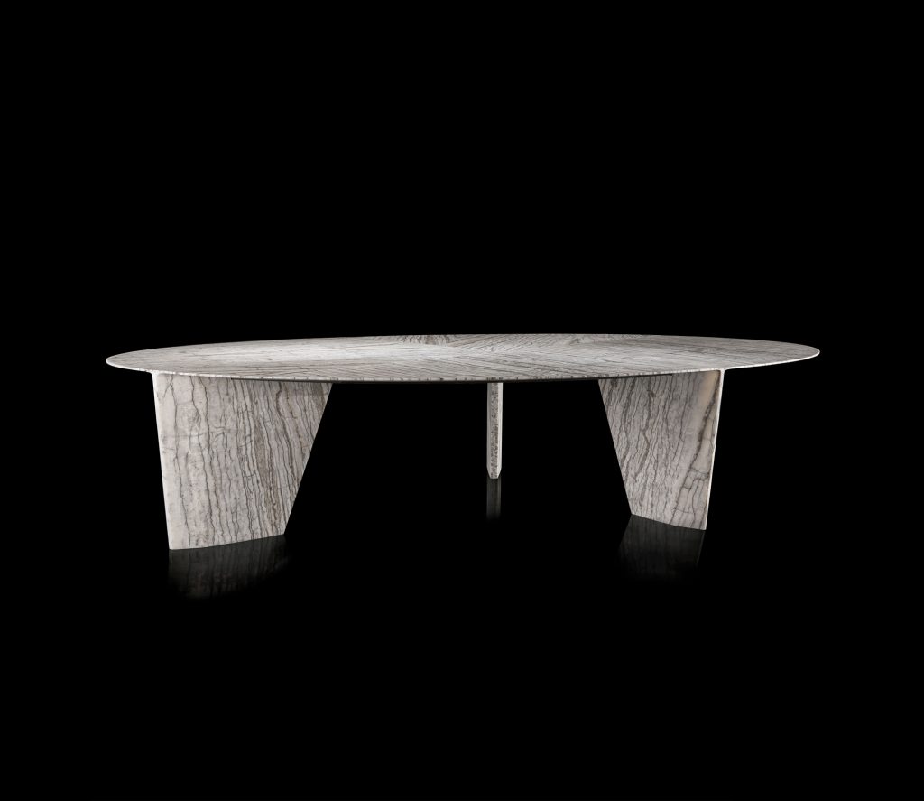 Sculptural combination of organic and rational lines, rigor, and freedom of expression, Synapse table boldly strikes a perfect balance between the sinuosity of an unusual elongated oval top and the incisiveness of three tapered rhomboid legs.