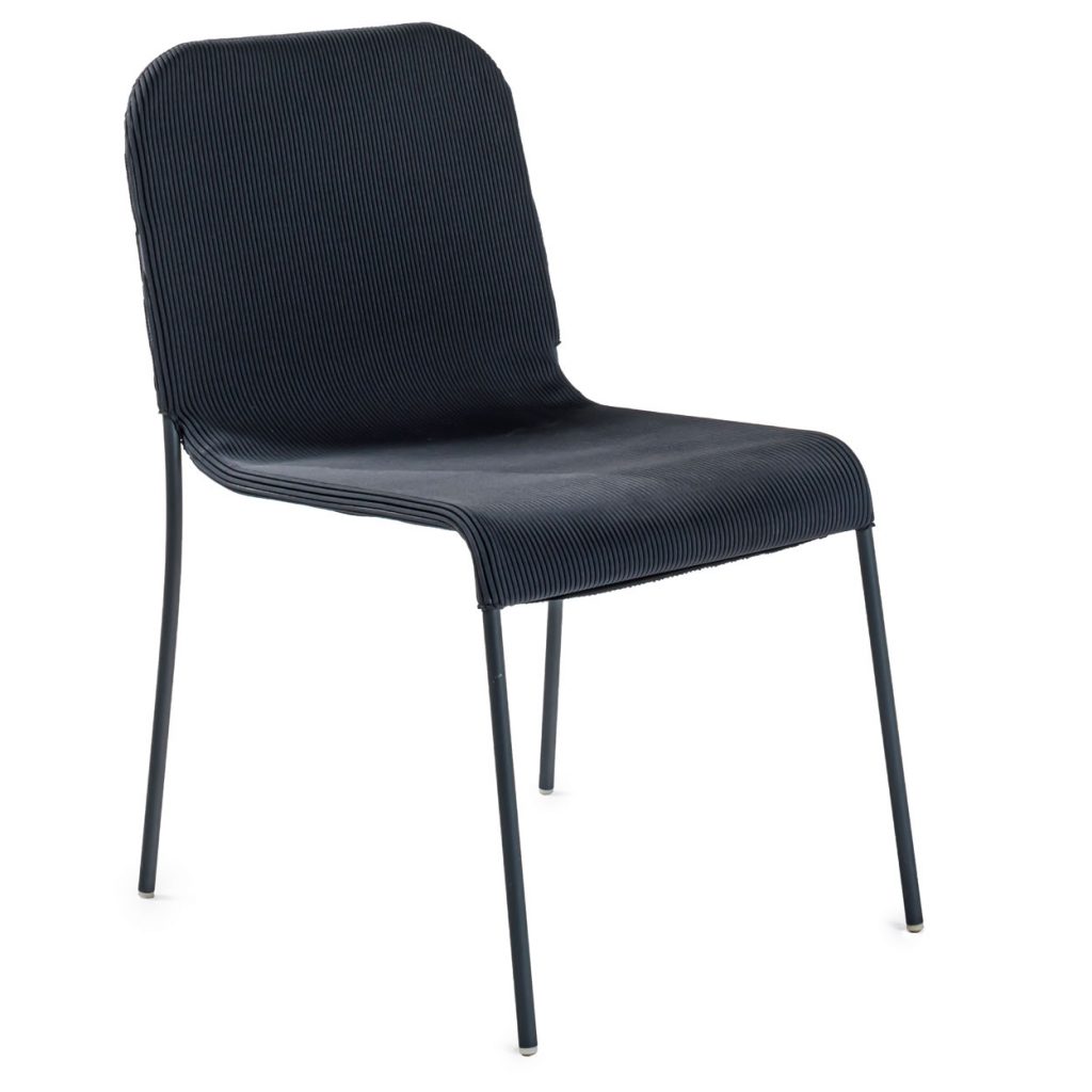 Stackable dining chair for outdoors with its seat and back rest covered in a dark blue textured fabric - lines: col#g430 - graphite. The chairs frame is made from stainless steel with a graphite powder coat finish.