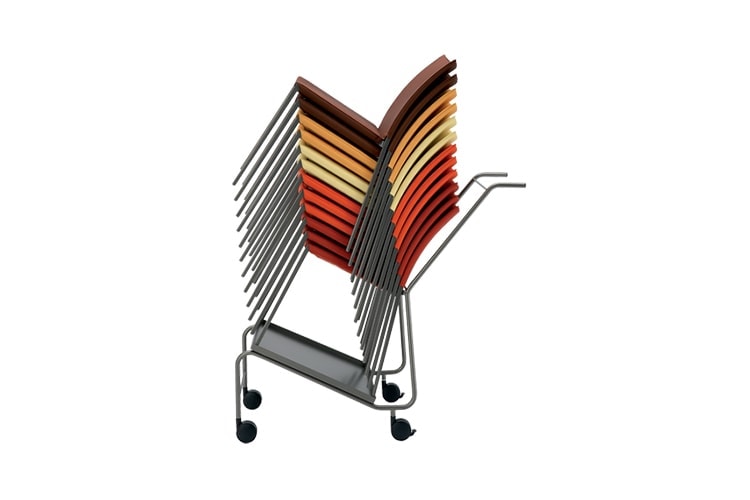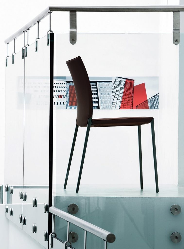 Aluminum alloy frame, polished or painted black, graphite or white. Seat and back upholstered in polyurethane. Removable cover in fabric or leather or non-removable in cowhide. Upon request two loose covers to be put on without fixing can be supplied: in 100% white cotton, available either short covering seat and backrest or long covering legs too. Upon request a trolley for carrying the stacked chairs (max 15 chairs) is available.