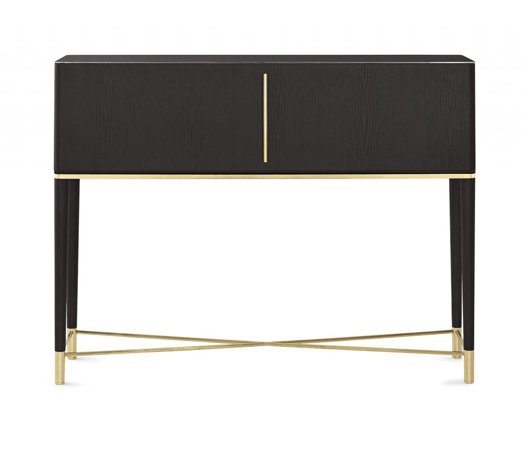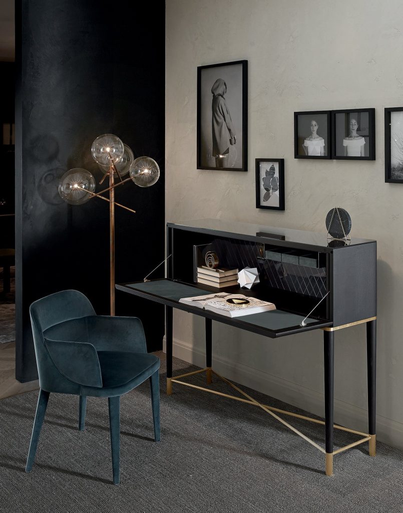 Desk with flap door in black lacquered ash. Satin brass details. 6mm bright liquorice painted tempered glass top and inside back. Rhomboidal engraved pattern on the inside glass back. Writing pad and small boxes covered by Grey 058 suede.