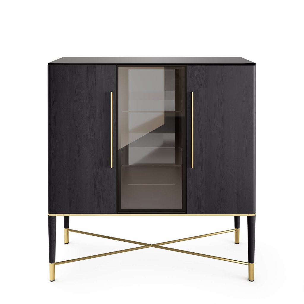 Sideboard in black open pore lacquered ash. Satin protected brass details. 6mm bright liquorice painted tempered glass top and inside back. Rhomboidal engraved pattern on the inside glass back. Supplied with smoked 'grigio Italia' glass shelves. With LED light.