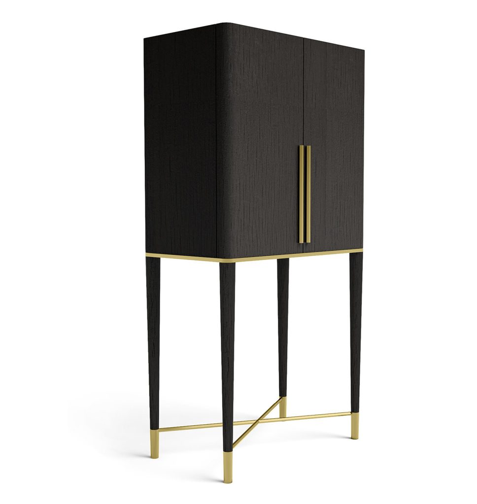 Black (mod. Layer) lacquered ash wooden bar unit and satin brass details. Inside covered with engraved smoked 'grigio Italia' mirror. With light.