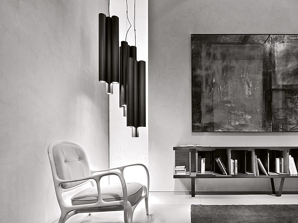Ceiling lamp composed of 1 or 4 tubes of different lengths, entirely made in burnished brass finish or aluminium painted in matt black or white. on request LED lighting.
