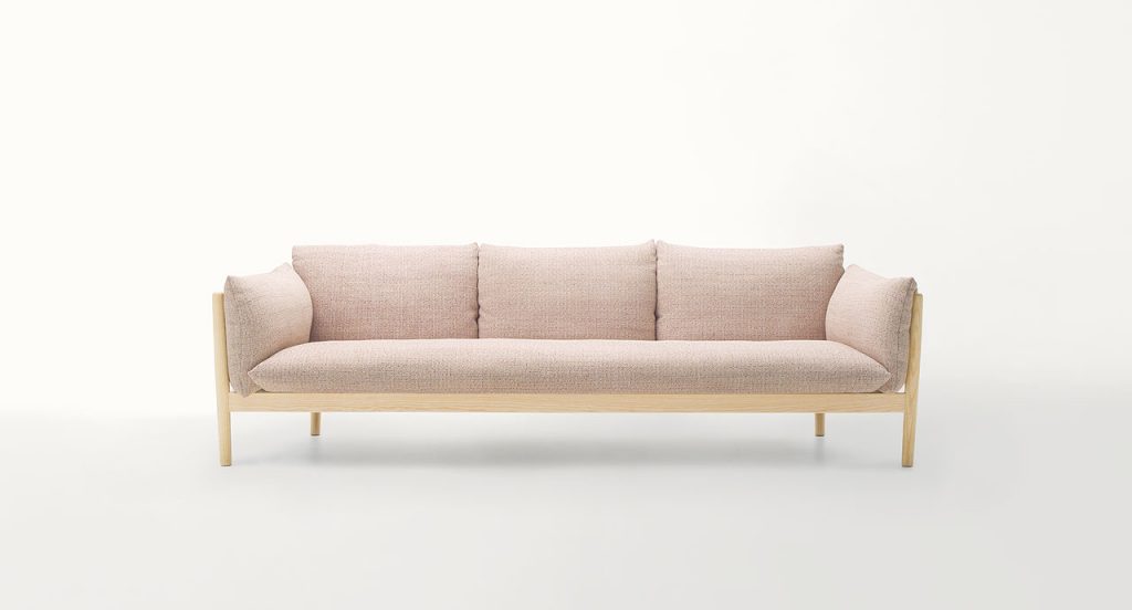 Three seater Tapio Sofa, structure and four legs in natural wood, upholstery in pink fabric in a living room.