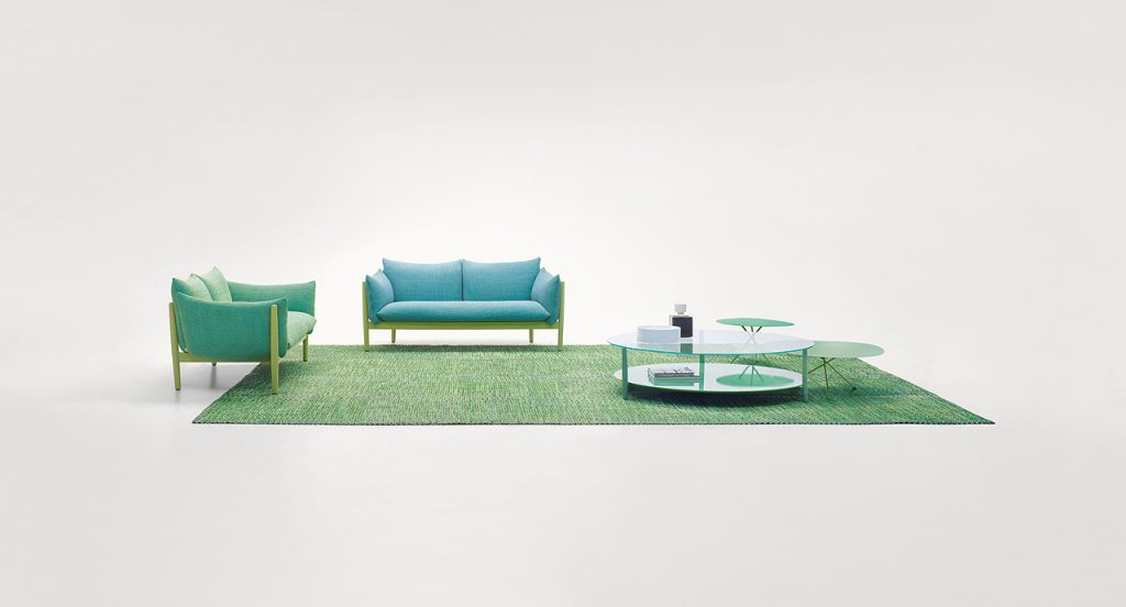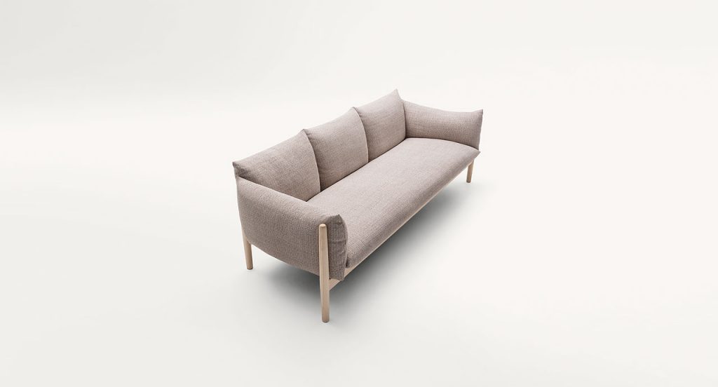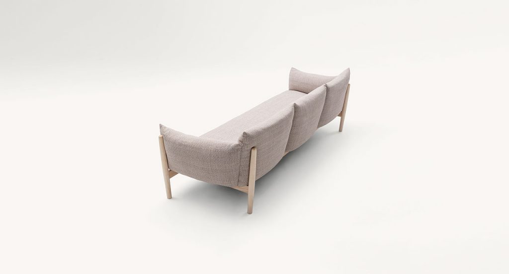 Two and three-seater sofa and platform with visible wooden structure and removable upholstery cover. The series Tapio also includes an armchair and side tables. - Internal structure: varnished steel; seat provided with elastic belts. - Visible structure: ash heartwood finished Mano Opaca. Plastic spacers. Padding: stress resistant differentiated expanded polyurethane; foam covering in polyester fiber and polyamide. - Upholstery: removable and available in a selection of fabrics in the collection. - Notes: We advise to use loose cushions for enhanced comfort; quantity and dimensions depend on the selected product.