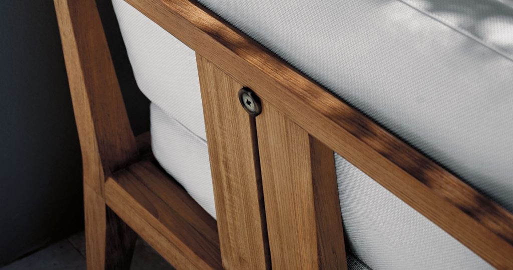 The mingling of different materials spotlights all the expressive force of teak which is mixed with Canatex fabrics for the seats. The refinement of the TEKA product is also expressed through the choice of some details, such as the use of buttons that perfectly fit into the design of the sofa backrest and arms, stopping the cushions from slipping and giving an aesthetic touch.