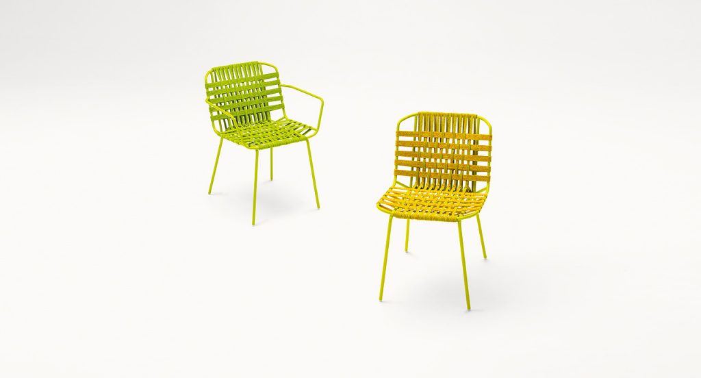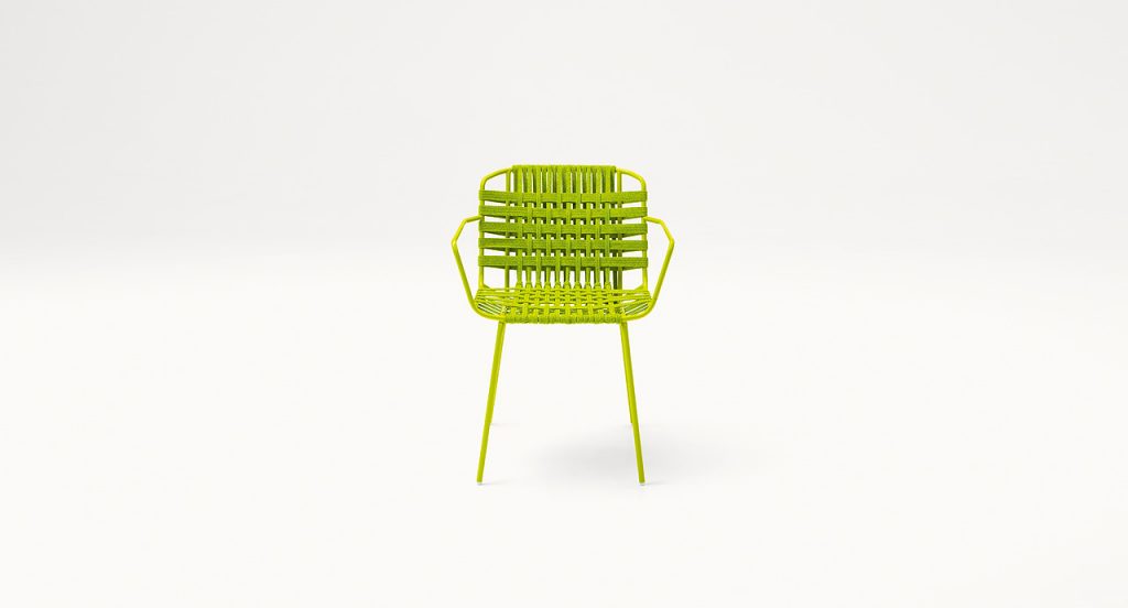 Chair with and without armrests with fixed upholstery, directly hand woven onto the structure. The series Telar also includes lounge chair, chaise longue and pouf. Structure: gloss varnished stainless steel, plastic spacers. Upholstery: fixed, hand woven with elastic belts of different dimensions covered with a braid in Rope yarn in solid colours or in two-colours combinations. Notes: This product can be used also in interior environments. We advise to use a Winter Set protection cover. Awards: Telar series has been awarded with the RED DOT BEST OF THE BEST 2020.