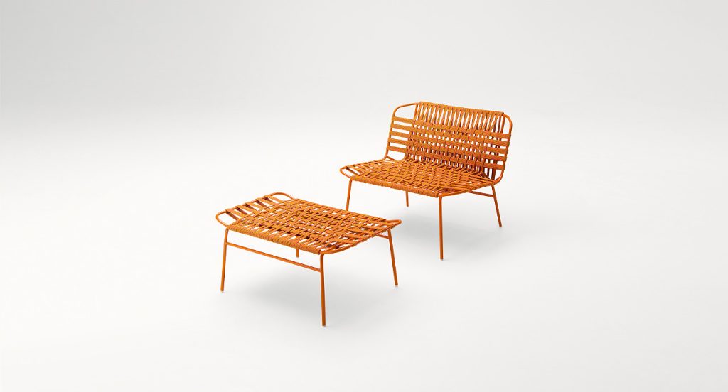 Pouf with fixed upholstery, directly hand woven onto the structure. The series Telar also includes chairs with and without armrests, lounge chair and chaise longue. Structure: gloss varnished stainless steel, plastic spacers. Upholstery: fixed, hand woven with elastic belts of different dimensions covered with a braid in Rope yarn in solid colours or in two-colours combinations. Notes: This product can be used also in interior environments. We advise to use a Winter Set protection cover. Awards: Telar series has been awarded with the RED DOT BEST OF THE BEST 2020.