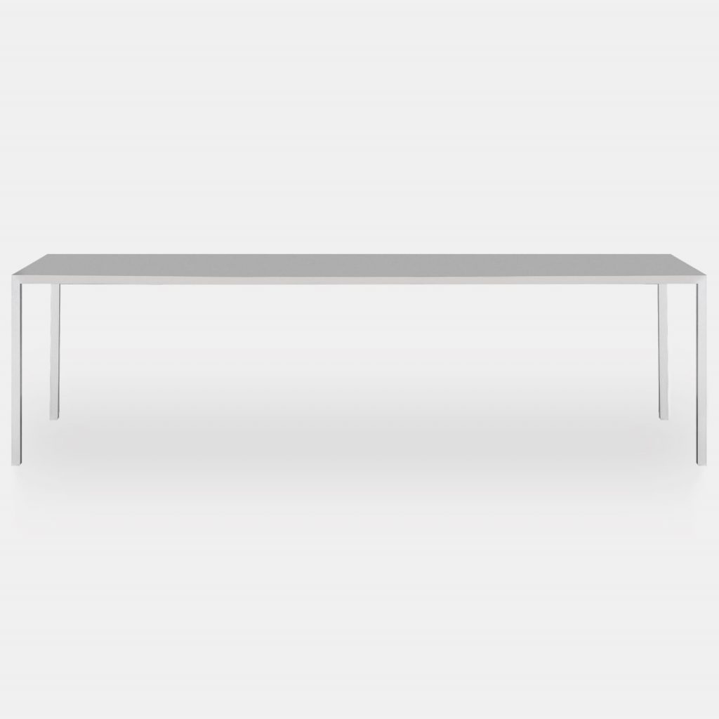 This was the genesis of Tense by Piergiorgio and Michele Cazzaniga. Tense represents the core, the primary concept of the table idea, so unique and minimal to adapt to many different spaces, both residential and contract. Tense is the table's soul, that expresses itself through a huge consistency in terms of shapes and finishes, the latter in a single material and identical for legs and top, sending a sensation of compactness and modernity. In its essentiality, this table hides a technological heart, encased in the top's panel, which enables, thanks to the internal tension, to achieve big dimensions, up to 4 meters. And, thanks to the minimum thickness of the top, Tense keeps in any case a high lightweight and stability. The possibility of coming in different sizes and colours enables Tense to meet every customer's need. Equipped with cable compartment, the table also lends itself to the needs of professional spaces. In 2019, to celebrate the 10th anniversary of the Tense table, MDF Italia introduces NEW SIZES AND FOUR NEW HEIGHTS (H35, H45, H90, H110 cm). So, a real table system was created, divided into 5 categories according to five heights, in order to meet different market needs: low table, coffee table/bench, dining table/working table, console/high table/high working table, high table bar/office.