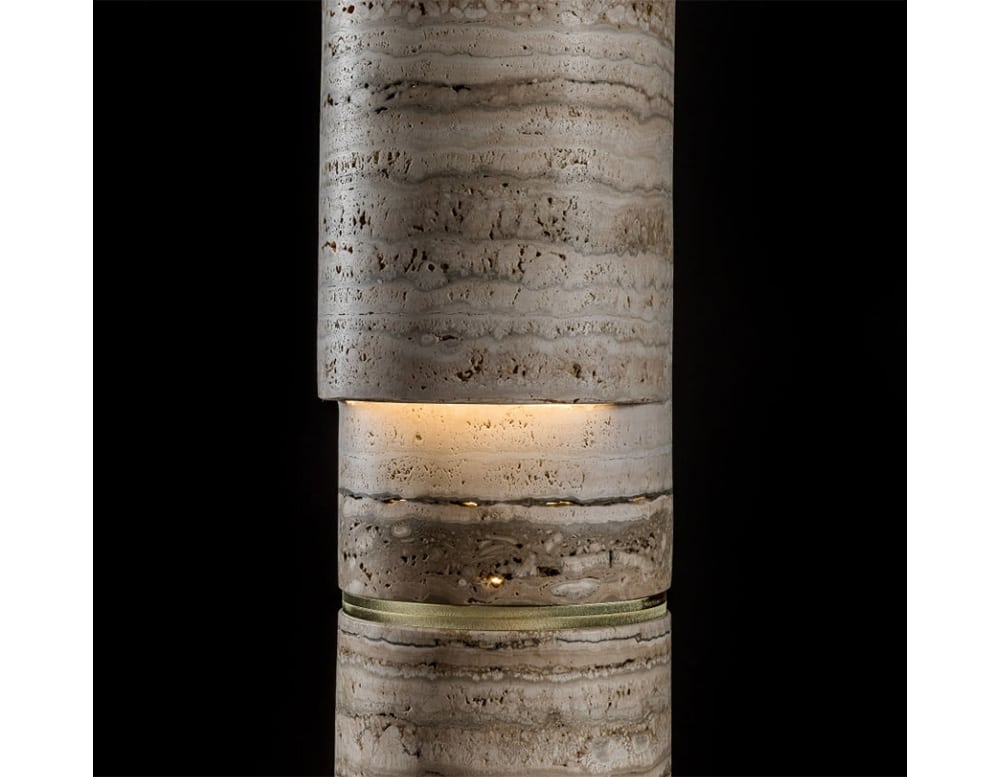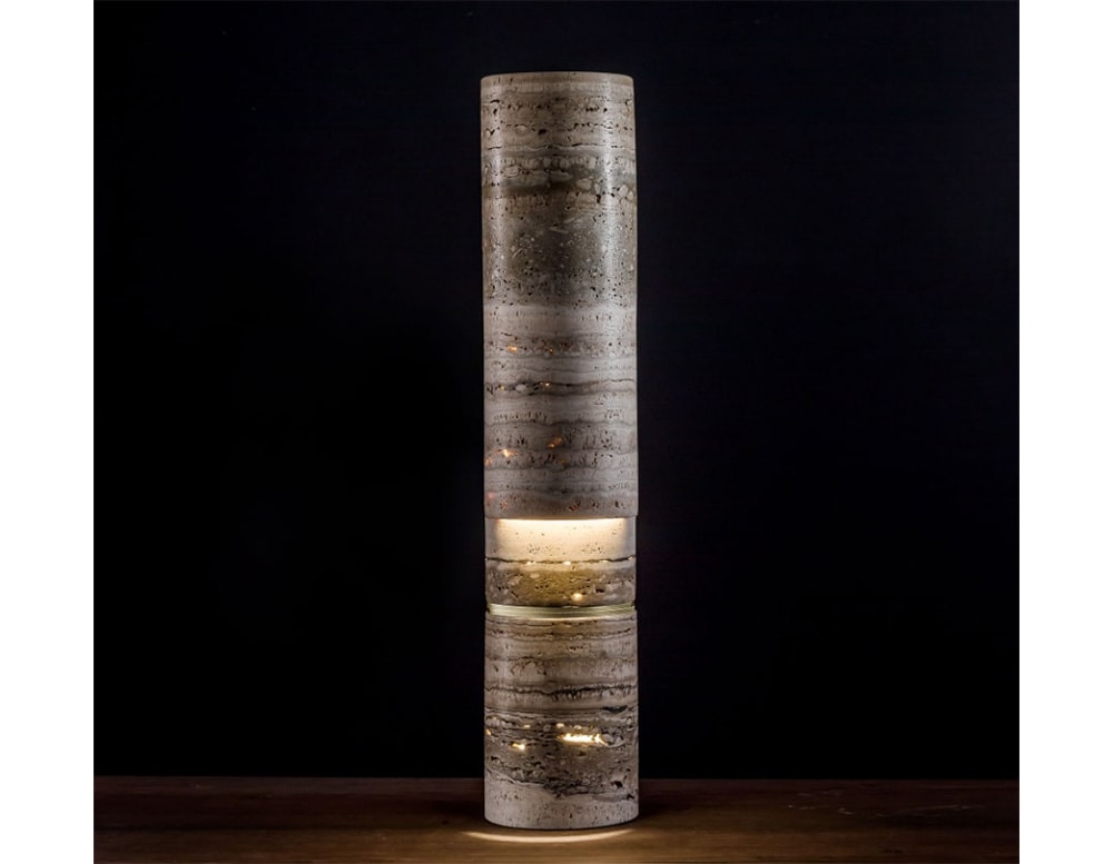 A floor or table lamp, the Test series is an elegant and slender stone monolith, characterized by essential lines and rich material opulence. A presence with a strong personality that reveals a hidden expressive soul: brutalism that transforms into sculptural opalescence or lights up through its natural cavities, conspiring for sophisticated atmospheres of intimacy. Sculptural stone table lamp with hollowed monolithic diffuser element connected by a rotating brass ring with a switch and dimmer function.