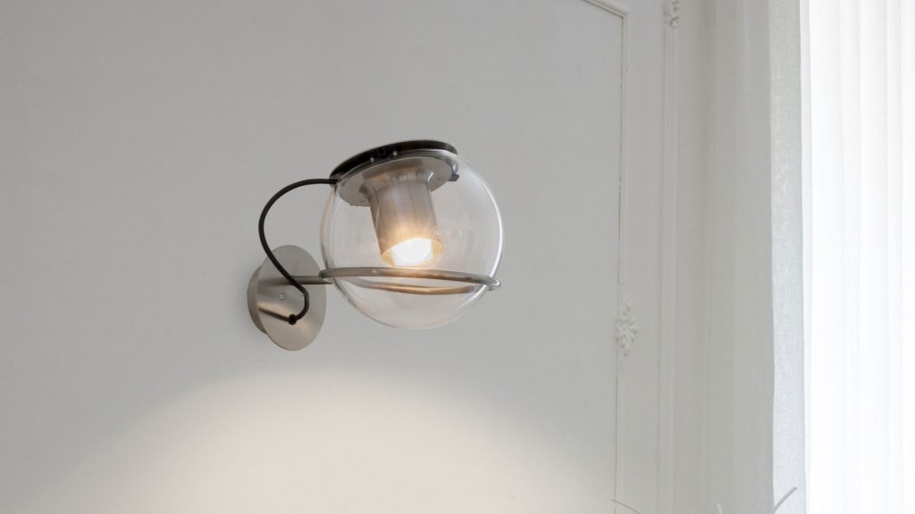 The Globe is a lamp which was designed by Joe Colombo in 1964, created in table, suspension and wall lamp versions, available in two sizes. Its pure geometries co-exist in a constant balance between shape and functionality: the transparent blown-glass sphere contains the cylindrical metal reflector that projects its timeless light into space, available in satin nickel or satin gold anodic bronze finishes.