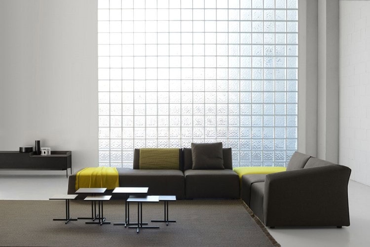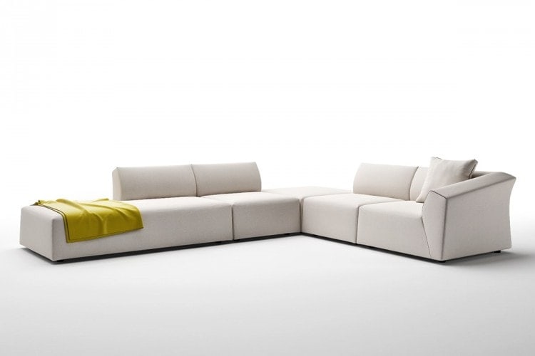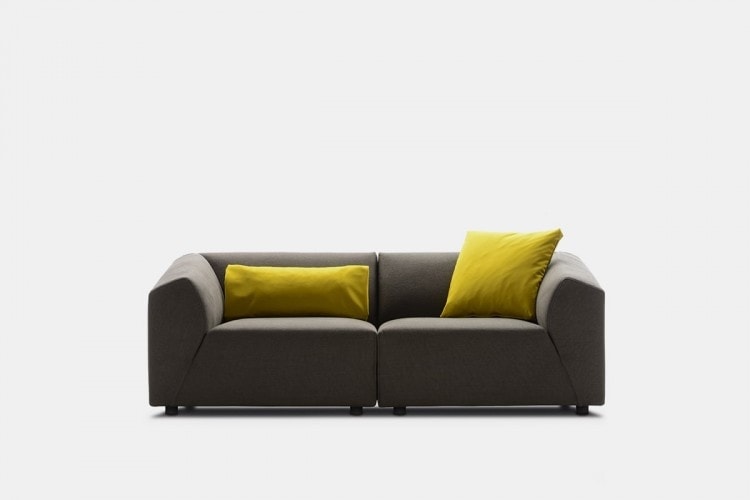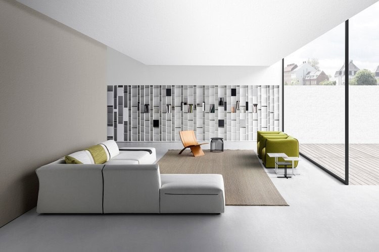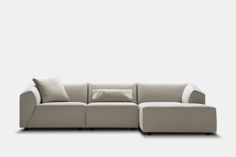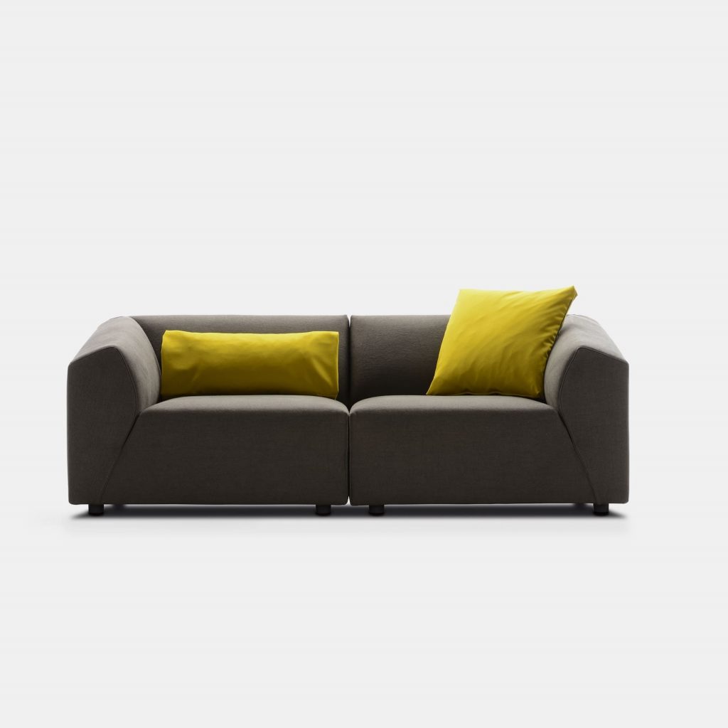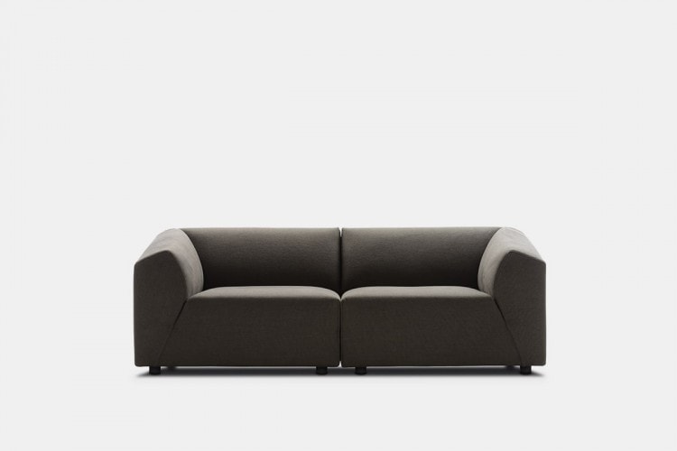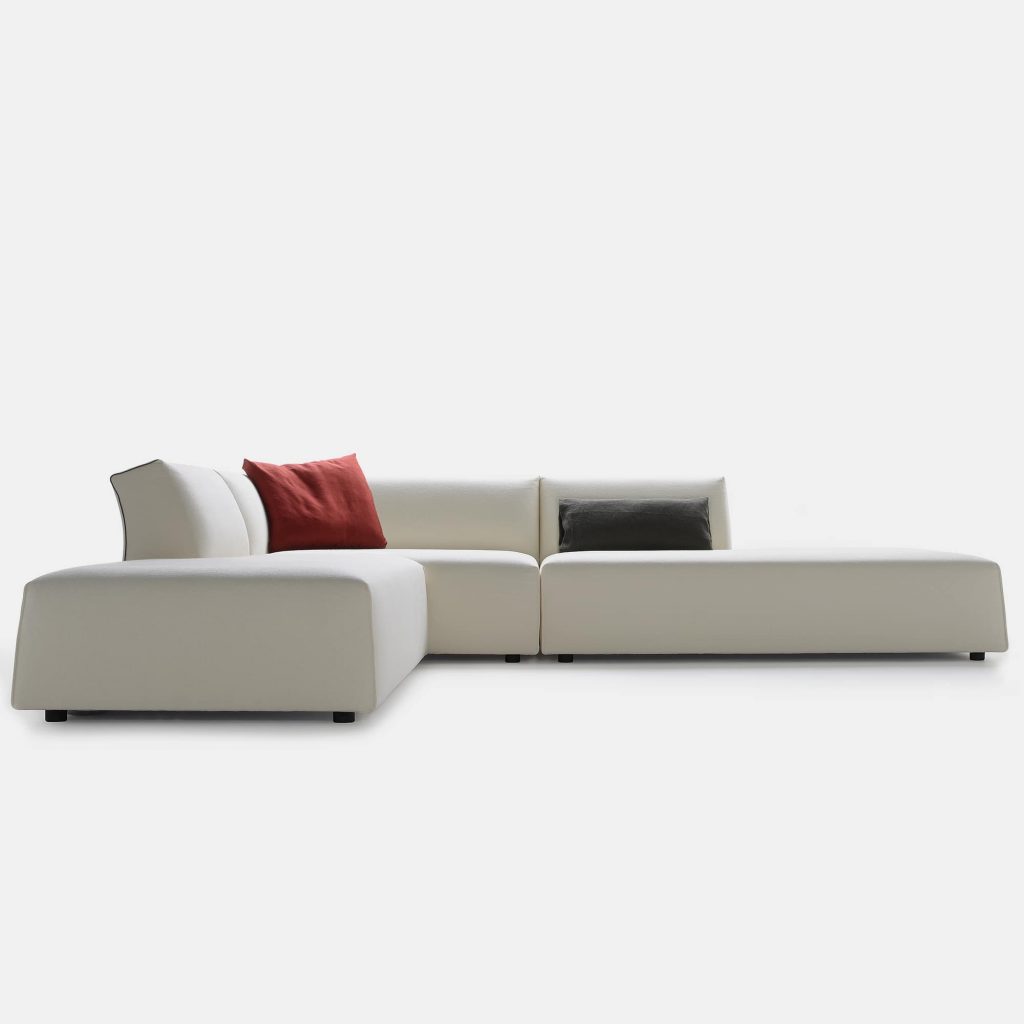 Thea, the new upholstered system, originates from the female interpretation of shapes and from the balance of guidelines in apparent antithesis: comfortable, cozy - tidy, dynamic - rigorous, lightweight - highly compact. Thea's eclecticism lies in the harmonious research of different points of view: frontally orthogonal, sideways tilted and concave on the back. The sofa is highly original and dynamic just because it melts all of these languages: it is a game of projections and shapes that gives its design a unique and recognisable sign. Womanhood is enhanced by the coating: just like a dress that wraps and drapes volumes, folds perfectly stick to the modules' shapes. Top care for tailoring details, as well as for the dictates of Italian tailoring, by using different seams. Application of bias seaming and contrast edging in three different colours (white, dove grey and anthracite grey) in order to define angles, curves and shapes.