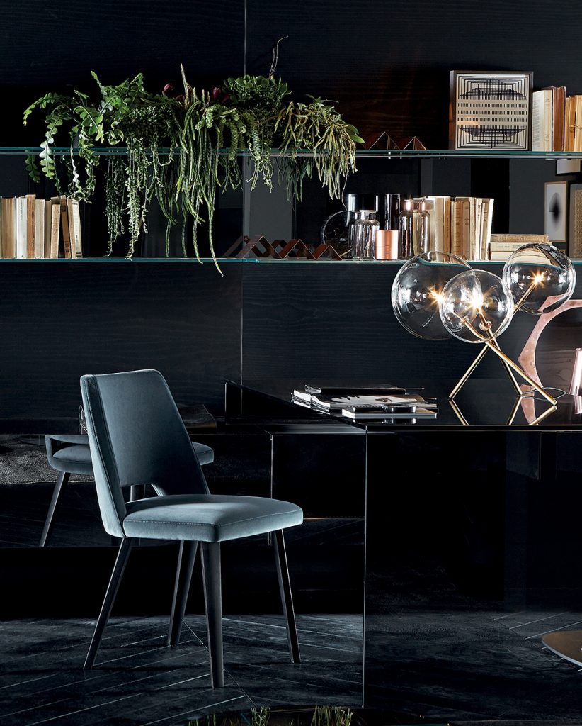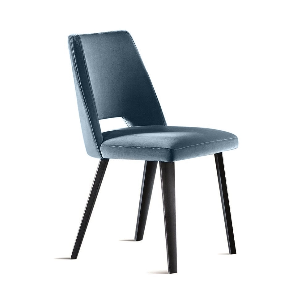 Dining chair upholstered in a light blue velvet cover - Velvet: Blue 408 Category A. The chair sits on wooden legs finished in black. Sold in a set of four.