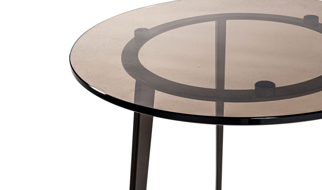 A round end table with a top made from bronzed glass. Straight edge. Metal legs finished with a dark bronze lacquer.