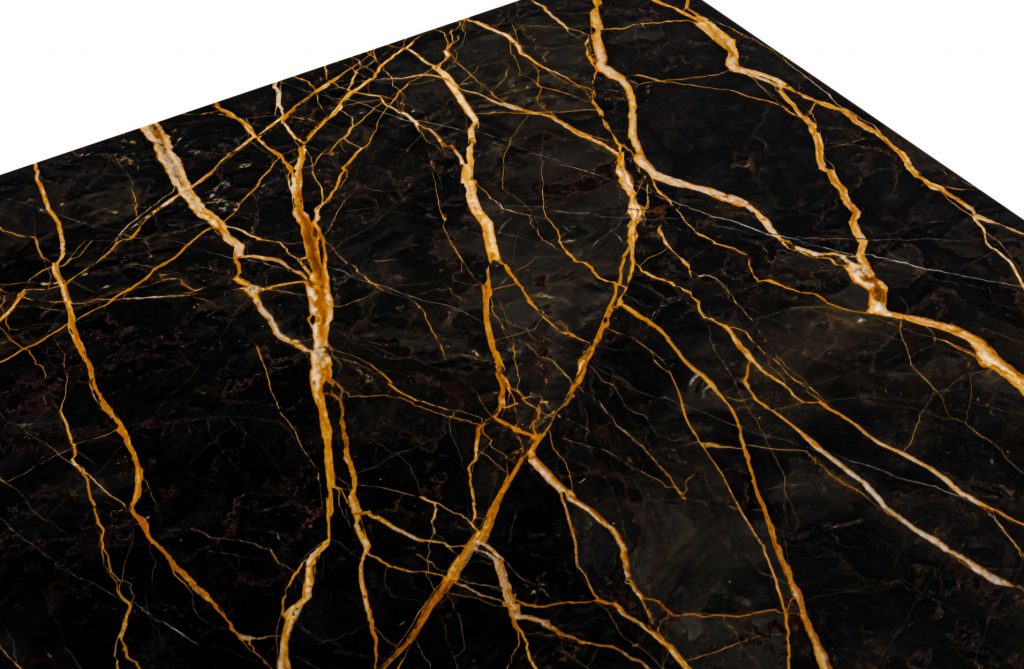 A round end table with a top made from bronzed glass. Straight edge. Metal legs finished with a dark bronze lacquer.