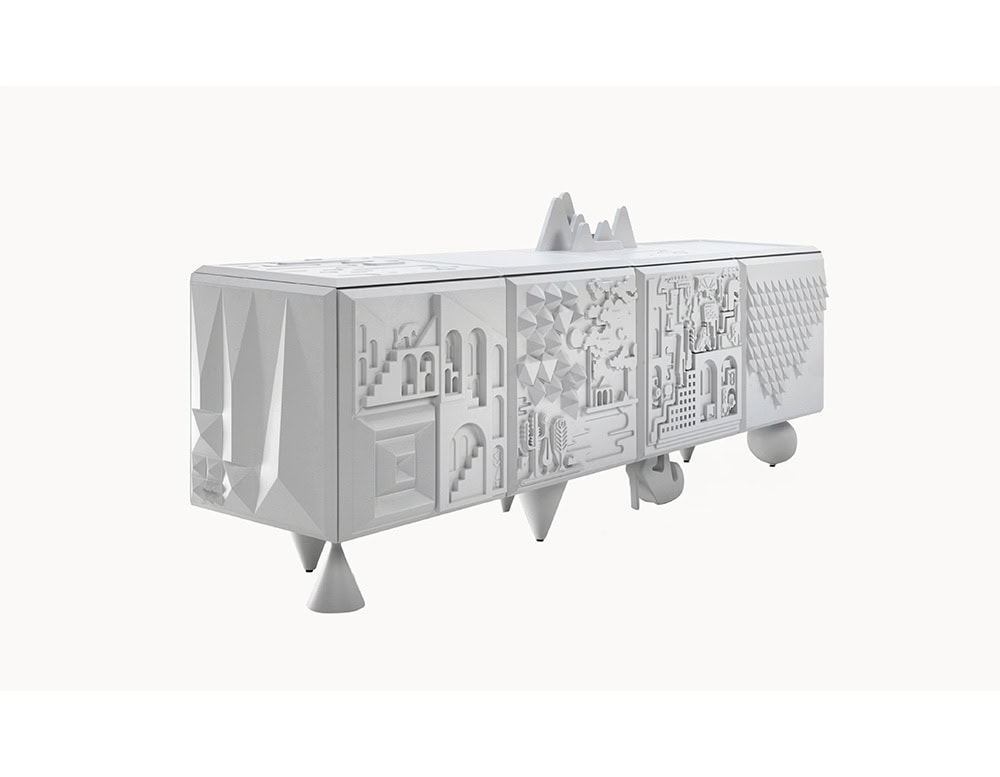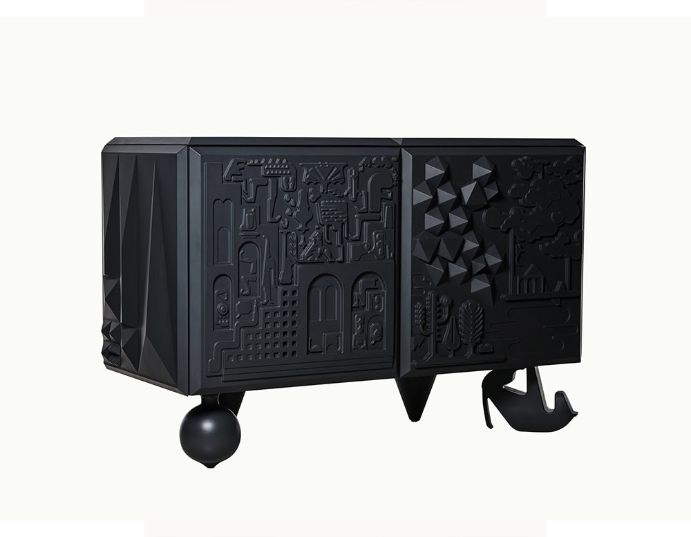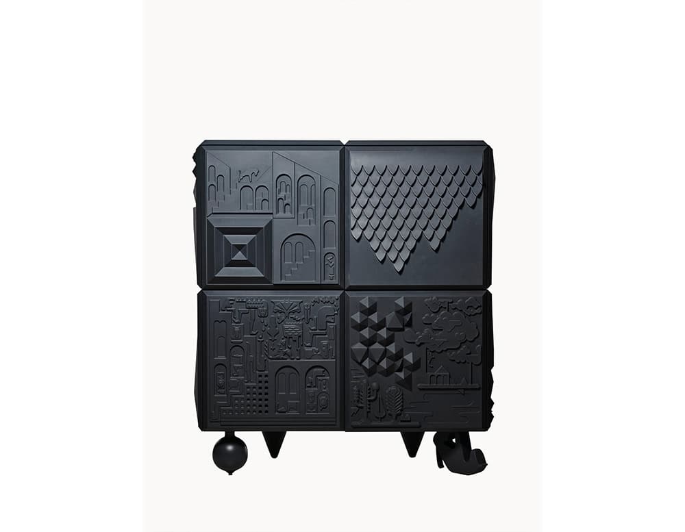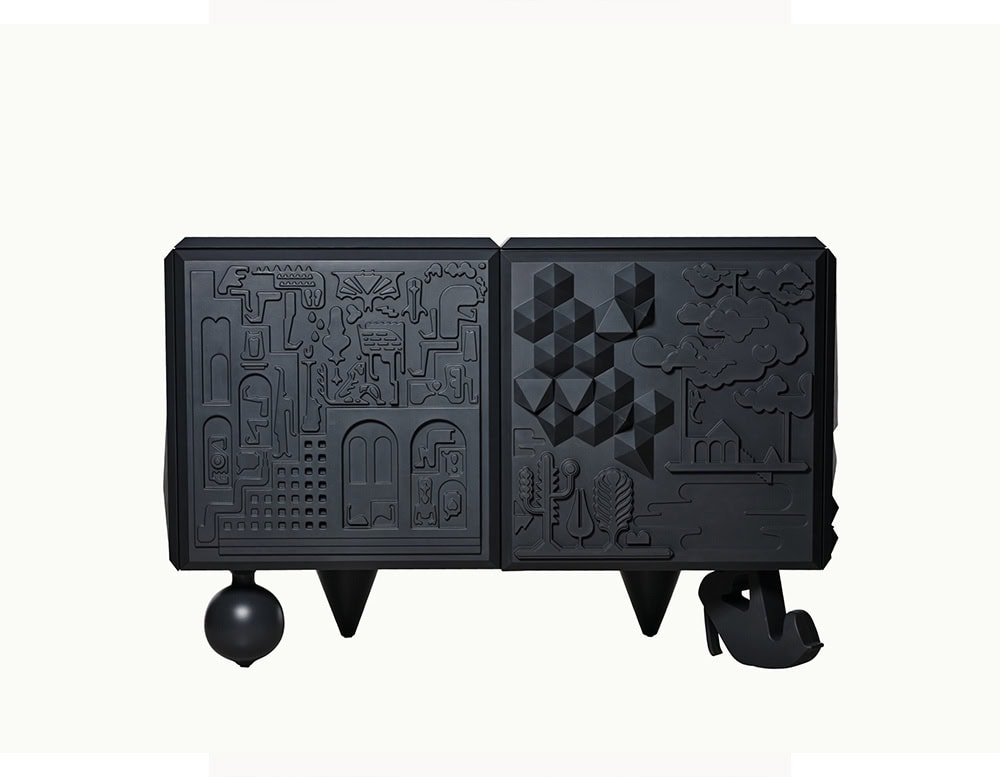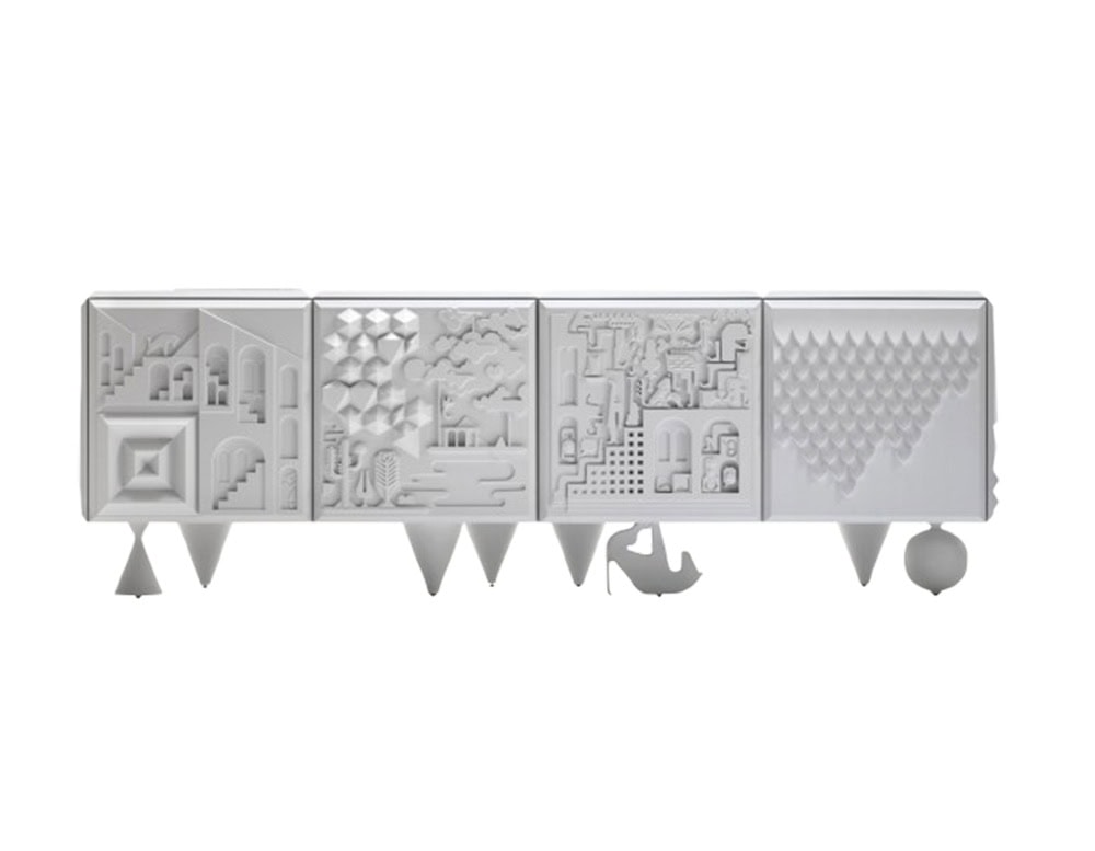 Designed by Antoine+Manuel, the Tout Va Bien cabinet is a textural masterpiece. Antoine Audiau and Manuel Warosz are Parisian graphic designers who developed the Tout Va Bien for BD for the 2009 Salone Del Mobile. It is both tactile experience and cabinet. It is covered by relief patterns from applied arts, hieroglyphic language, fantasy and optimism. The cabinet is modular and fits into various spaces in different configurations while sitting on four different leg styles. It is fantasy in furniture.