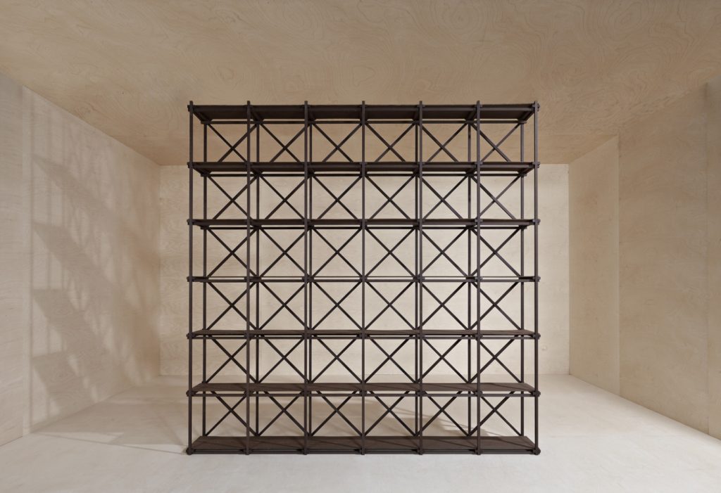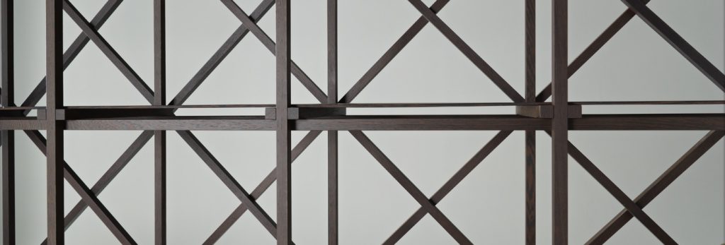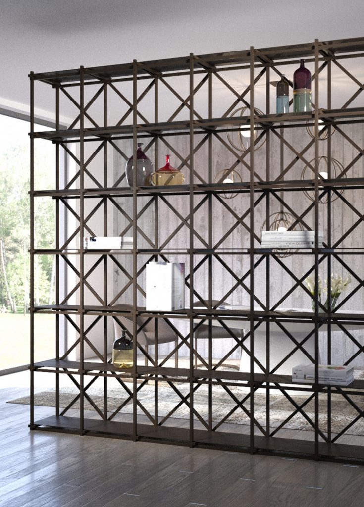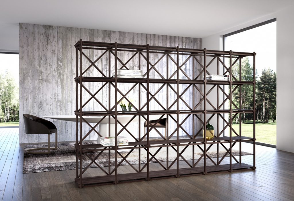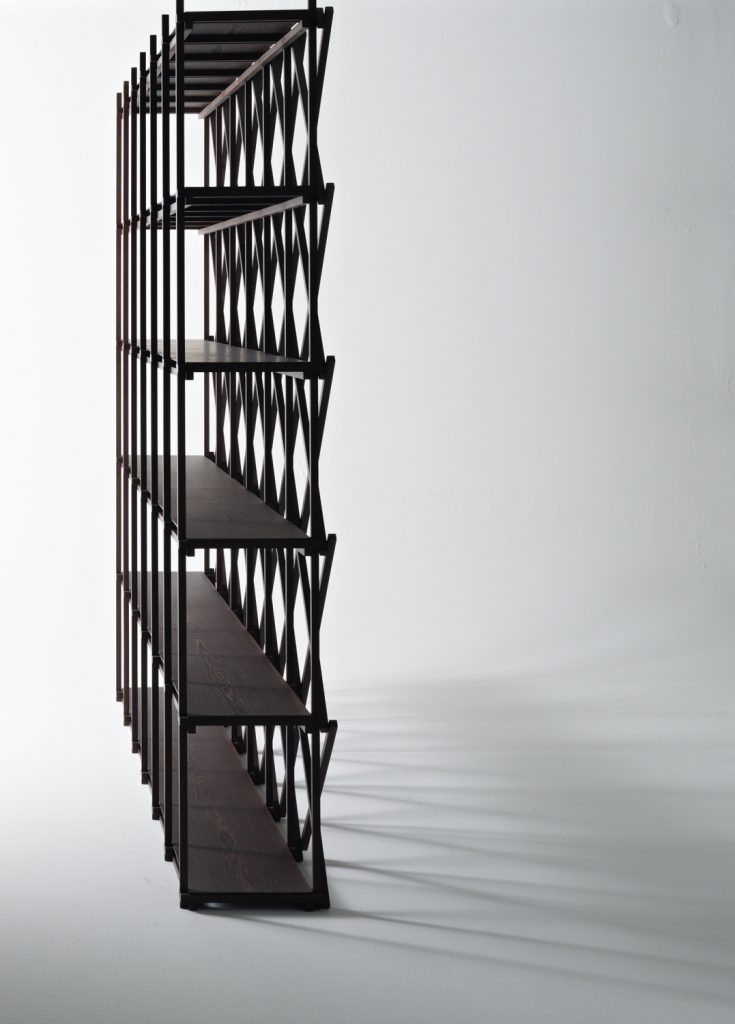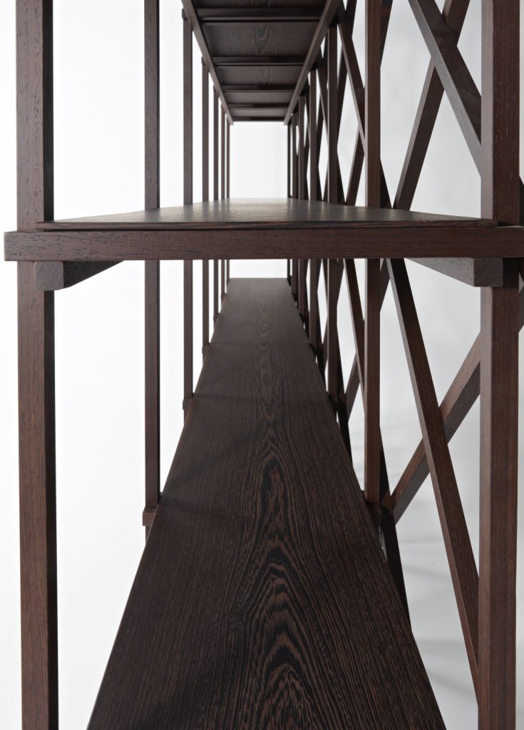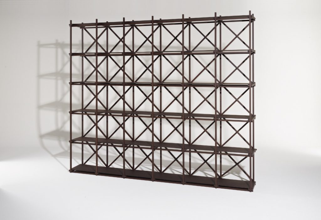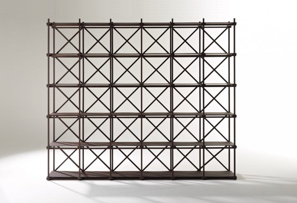Bookshelf and room-divider system made of beams of solid wood with thin shelves of wood. Square spaces cm.42.