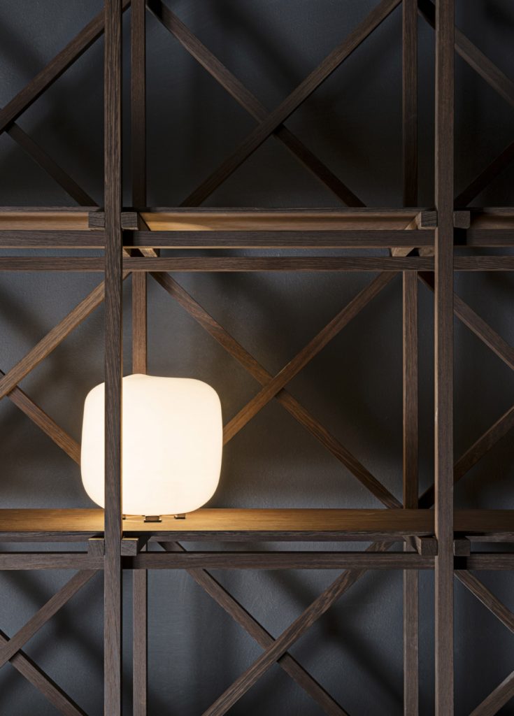 shelf made of solid wood beams in a brown tone with a lamp on it
