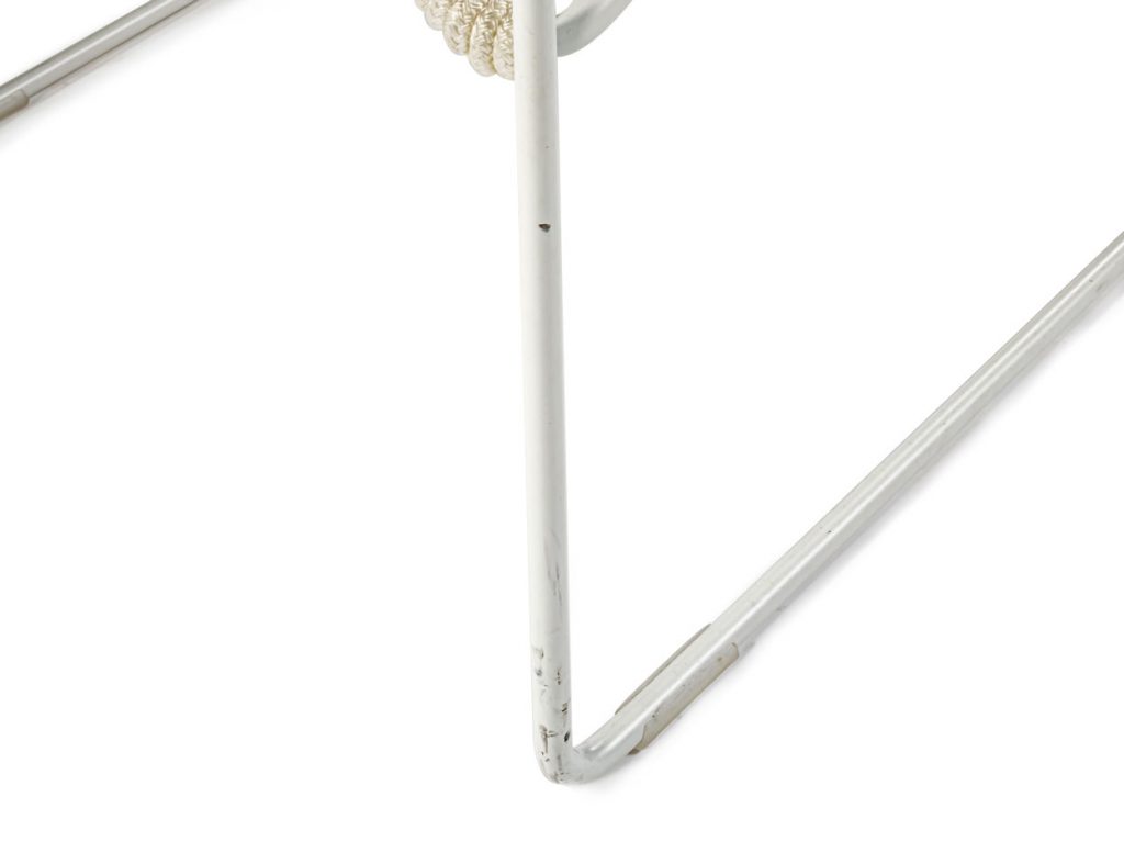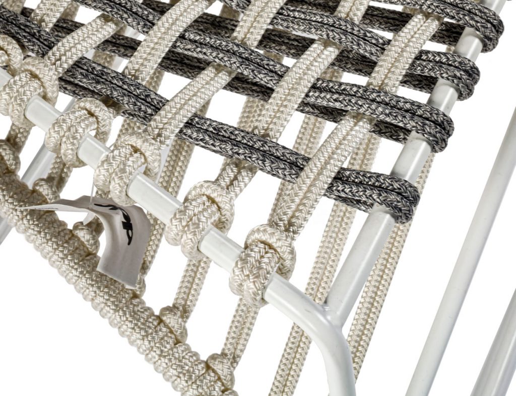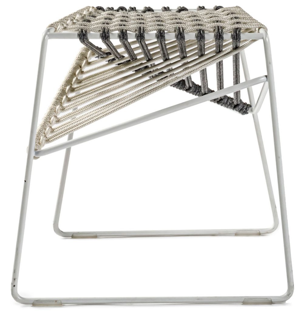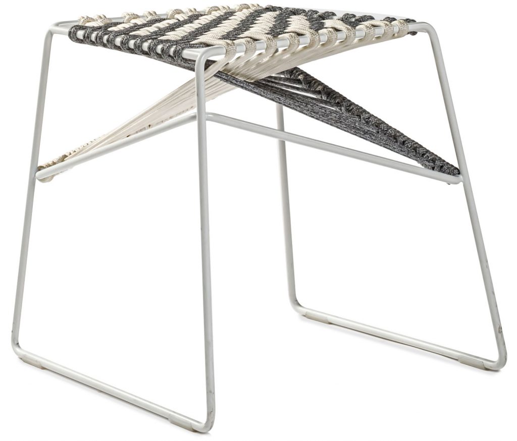 Low stool with a seat composed of high-tenacity polyester cords in white and gray with nylon internal reinforcement for outdoor use. Steel frame with a weather safe finish in white.