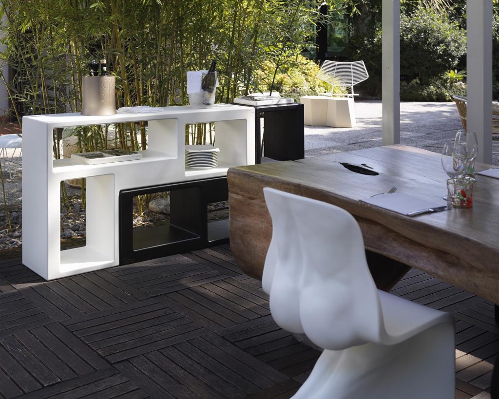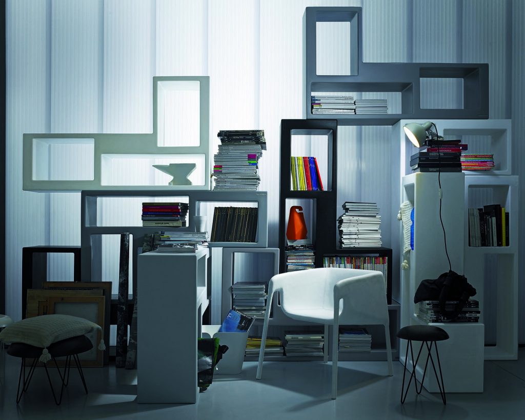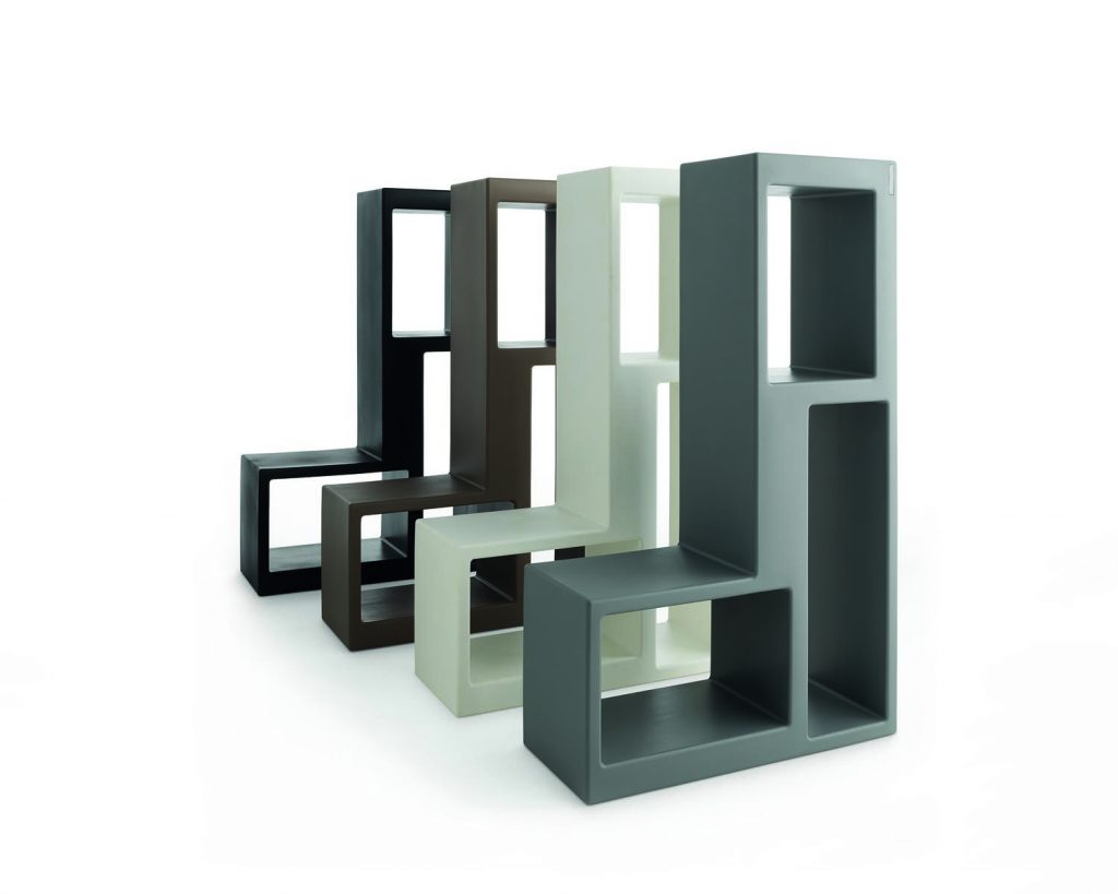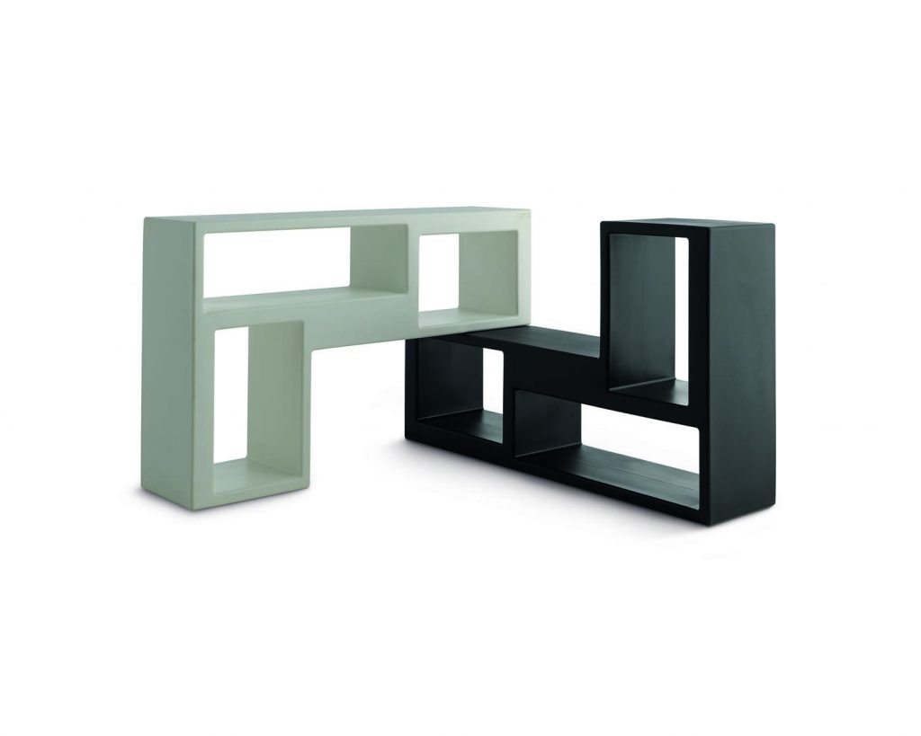 The L shaped polyethilene module can be used in any position. A system without hooks or joints which allows the user to create walls, screens, horizontal and vertical elements, angles, benches, entertainment systems everything that comes to mind. The niches carved out of the piece underline the monolithic and solid nature of the Urban shelving unit. A modern piece which stands above the whims of fashion. The infinite possibilities of composition allow the user to create surprising landscapes and furnish the spaces in a dynamic and bright way.