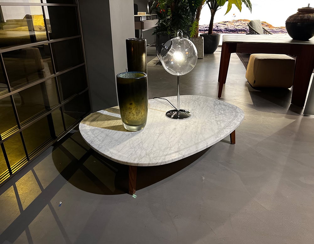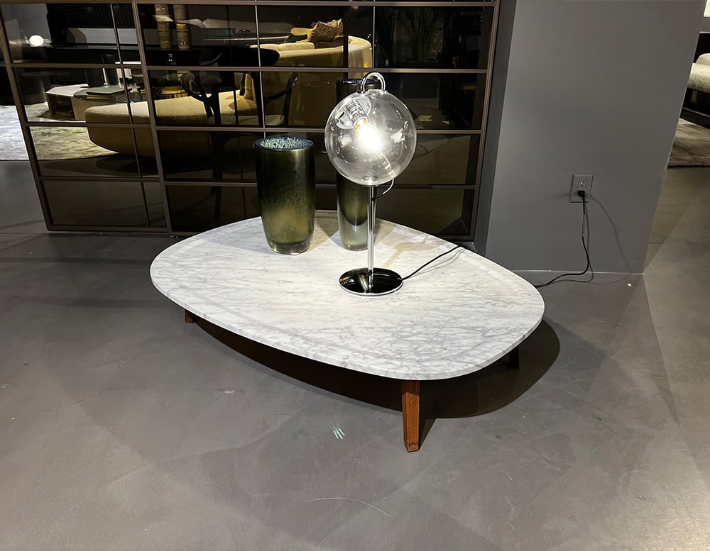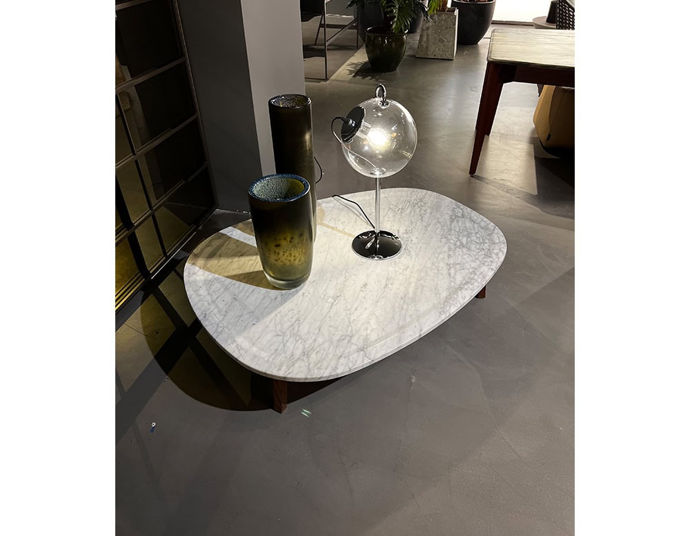 Coffee table with ash base in a walnut stain. Table top in White Carrara Gioia marble (2cm thick).