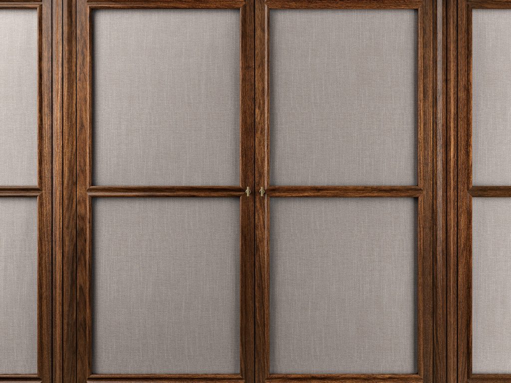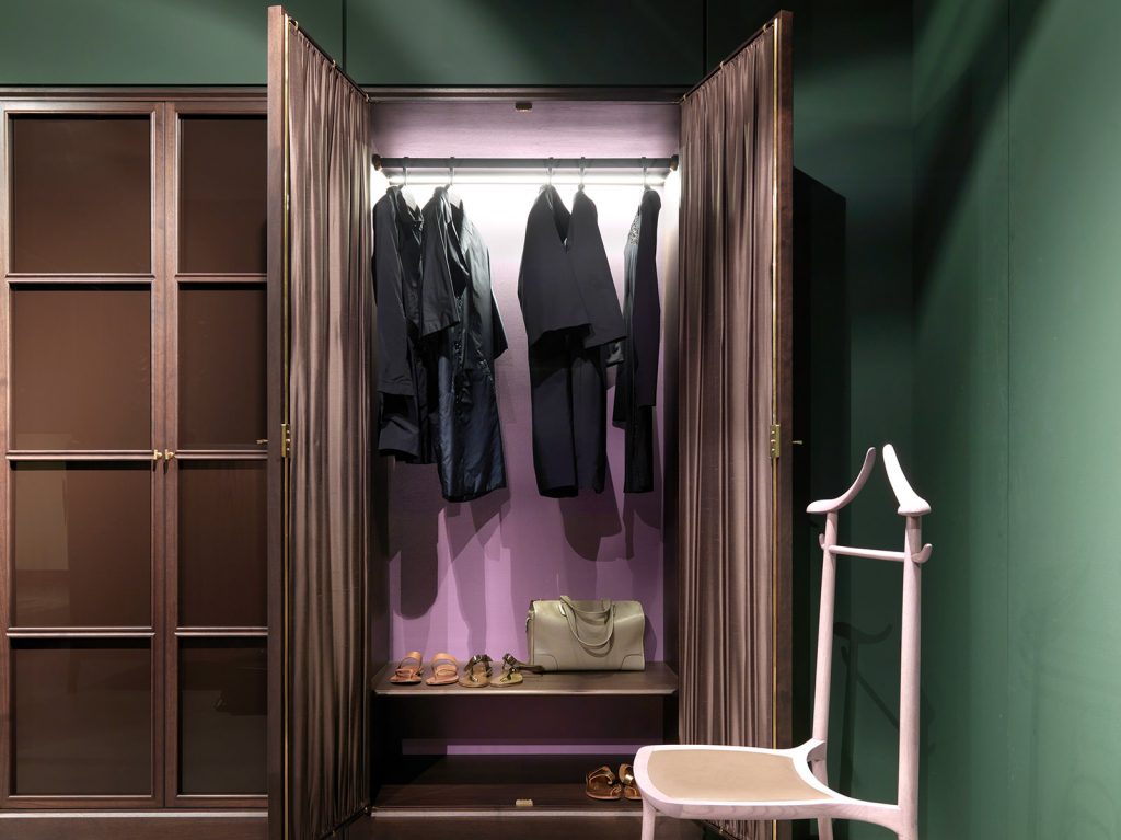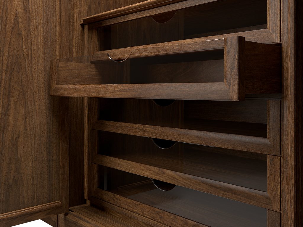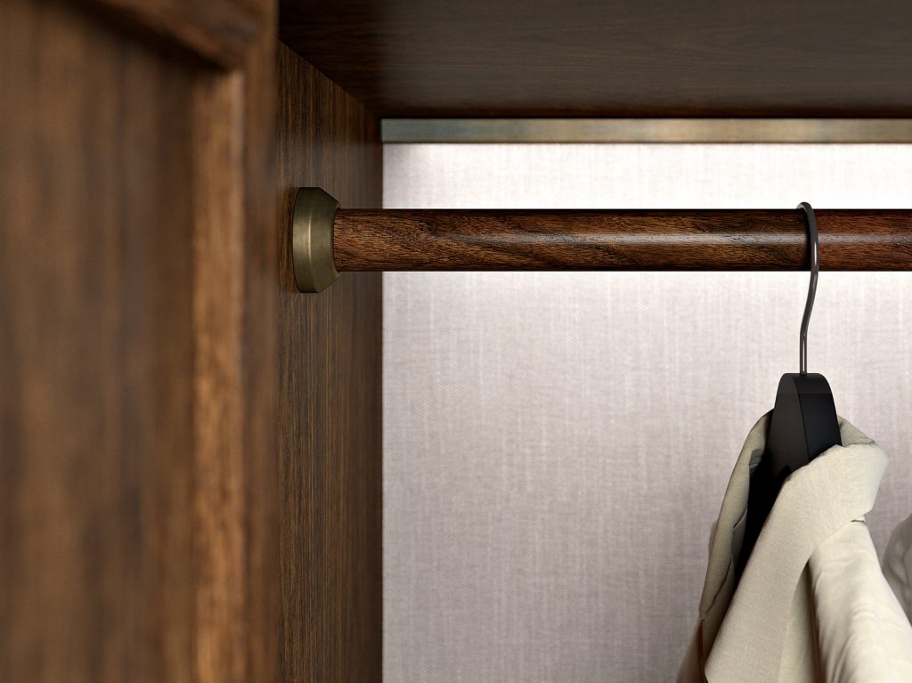 Wardrobe made in solid american walnut and veneered plywood, 4mm transparent glass door with 1 or 3 door-frames, hardware in burnished brass, wooden shelf-rack, 1 internal fixed shelf and wooden hanging rail.