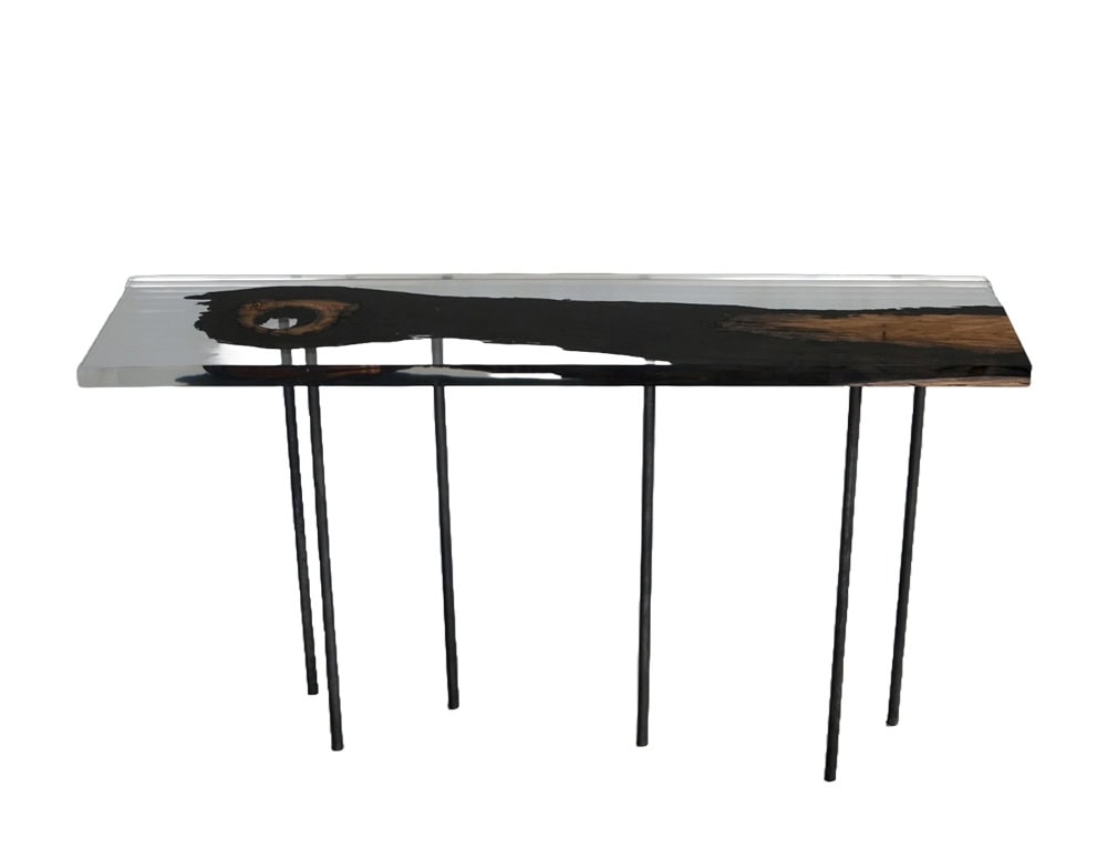 Wetland Relic _ Console is made of ABONOS OAK WOOD preserved in EXTRACLEAR RESIN, resembling the water that has kept it over millennia. The base is in BURNISHED STEEL.