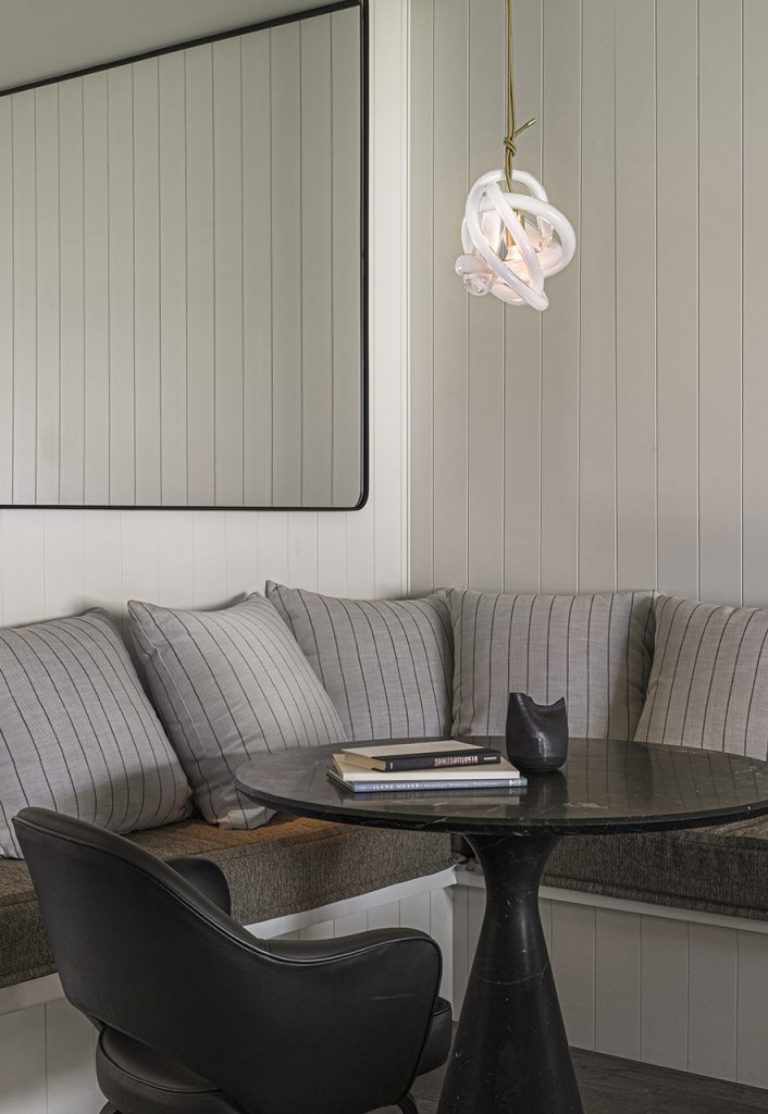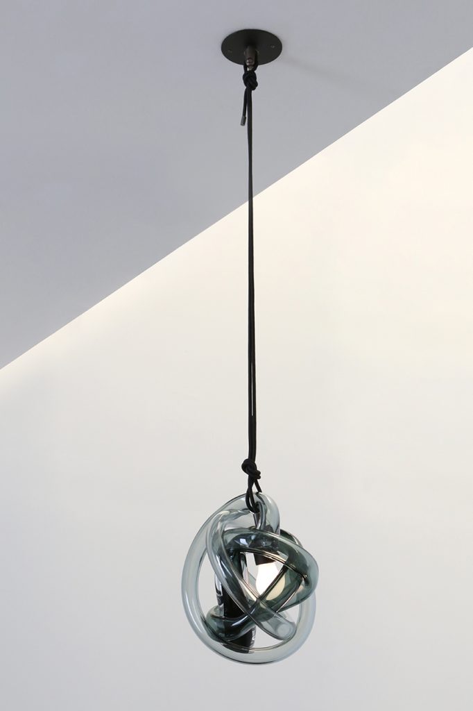 Our signature SkLO Large Wrap, a continuous wound length of handblown glass tube, is transformed into a pendant. Suspended on a hand-tied length of fabric-wrapped electrical cord. The socket is also suspended on a matching intertwined length of fabric-wrapped electrical cord and allows the light bulb to be nestled within the glass element.