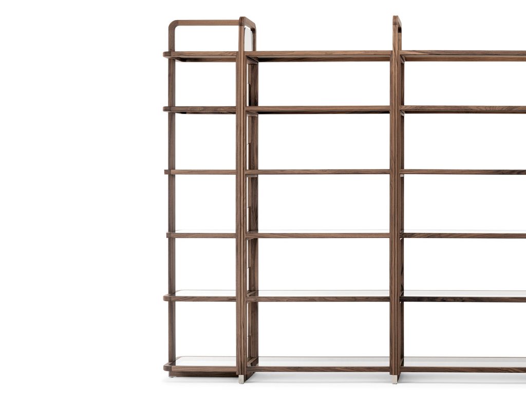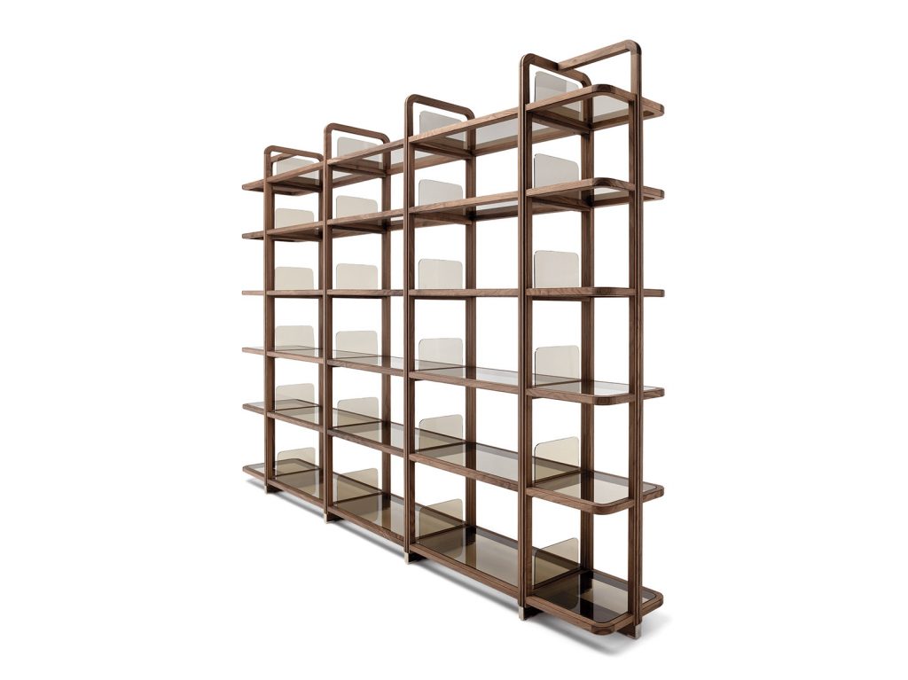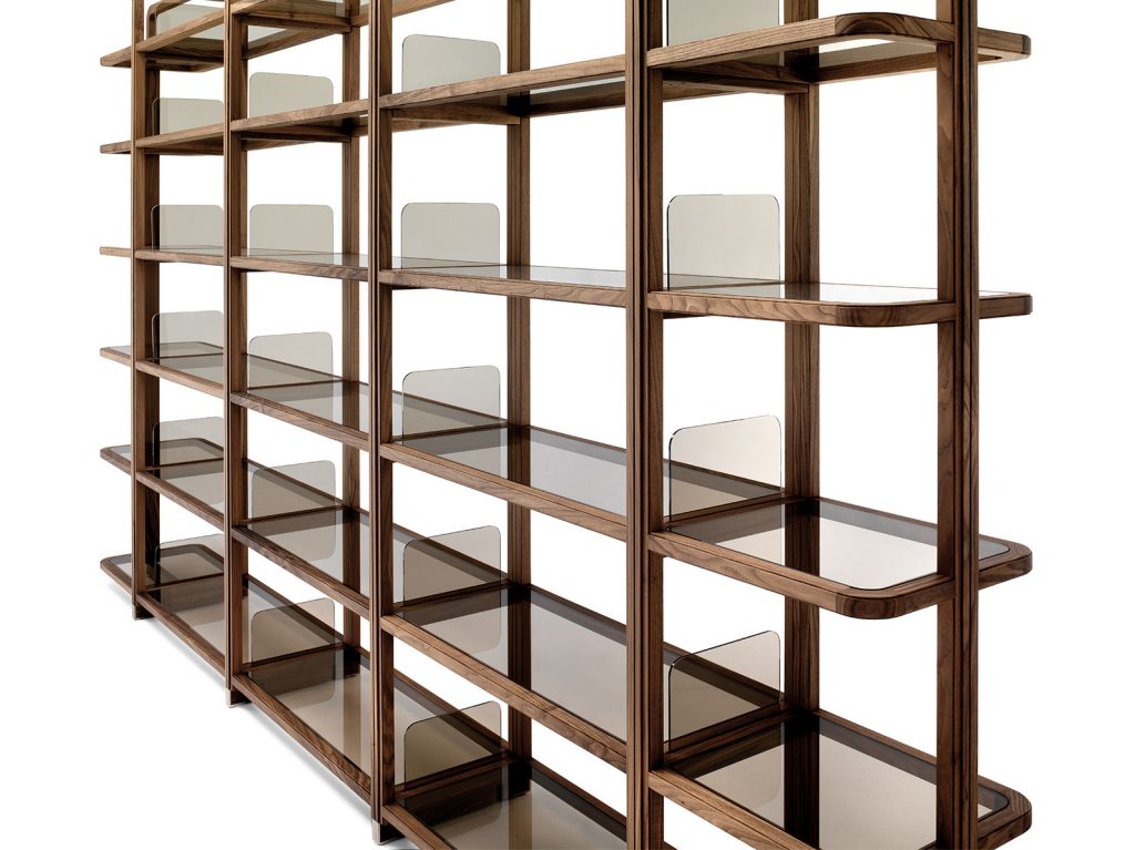 Modular freestanding bookcase made in solid american walnut, adjustable feet in satin stainless steel, shelves and bookstop partitions in glass transparent, bronzed or smoked.