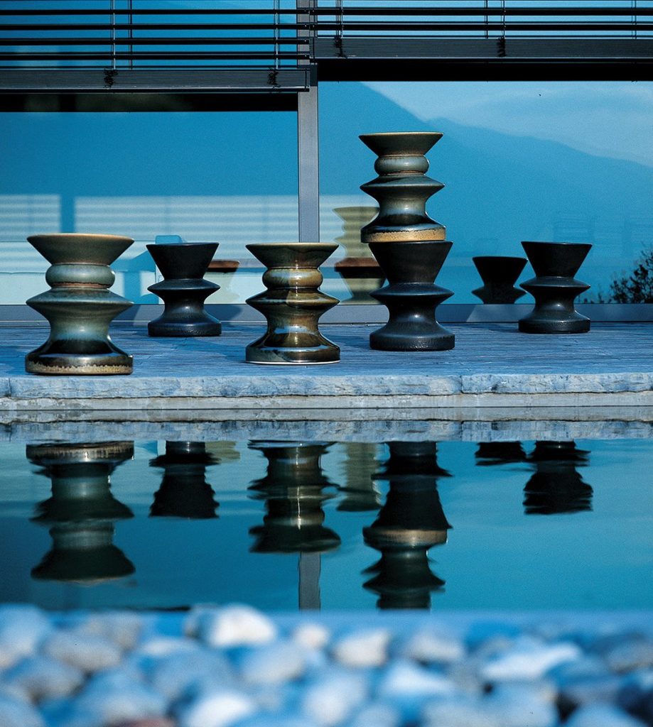 Freeze-resistant frame in fine porcelainized grès for outdoors use with thickness controlled two-layering applied by hand and baked at 1250°C with a 36 hour processing cycle, colour blue-brown.