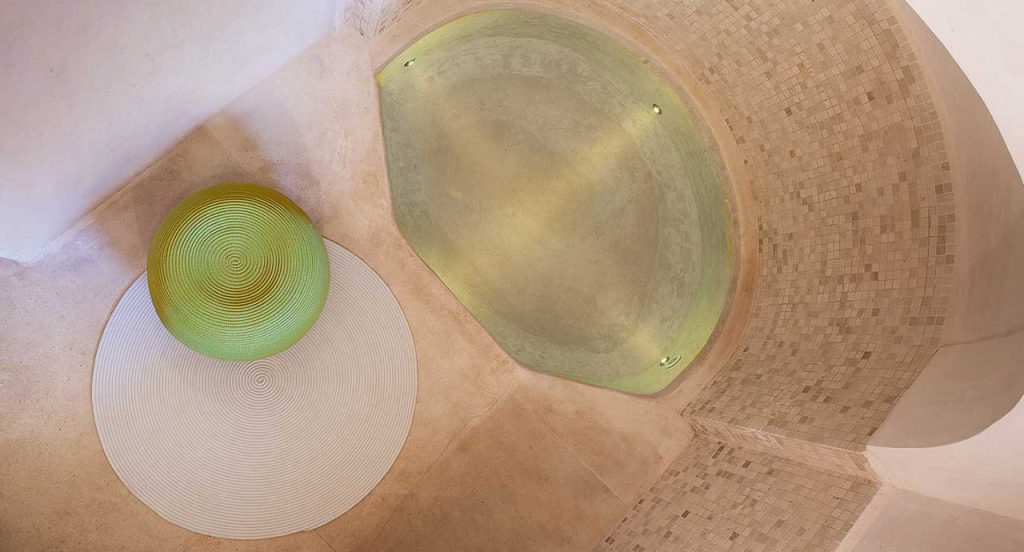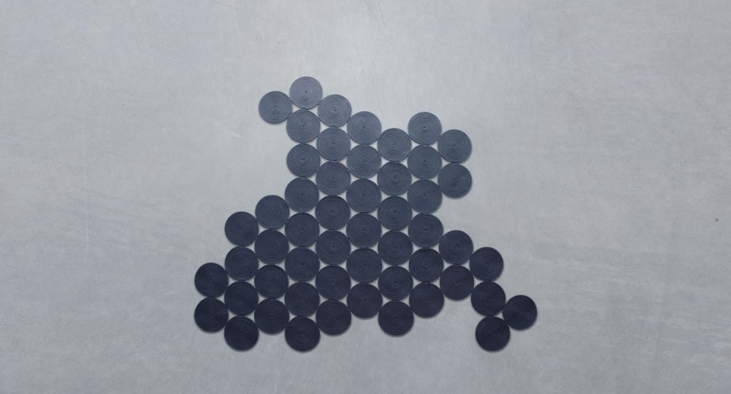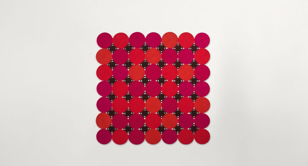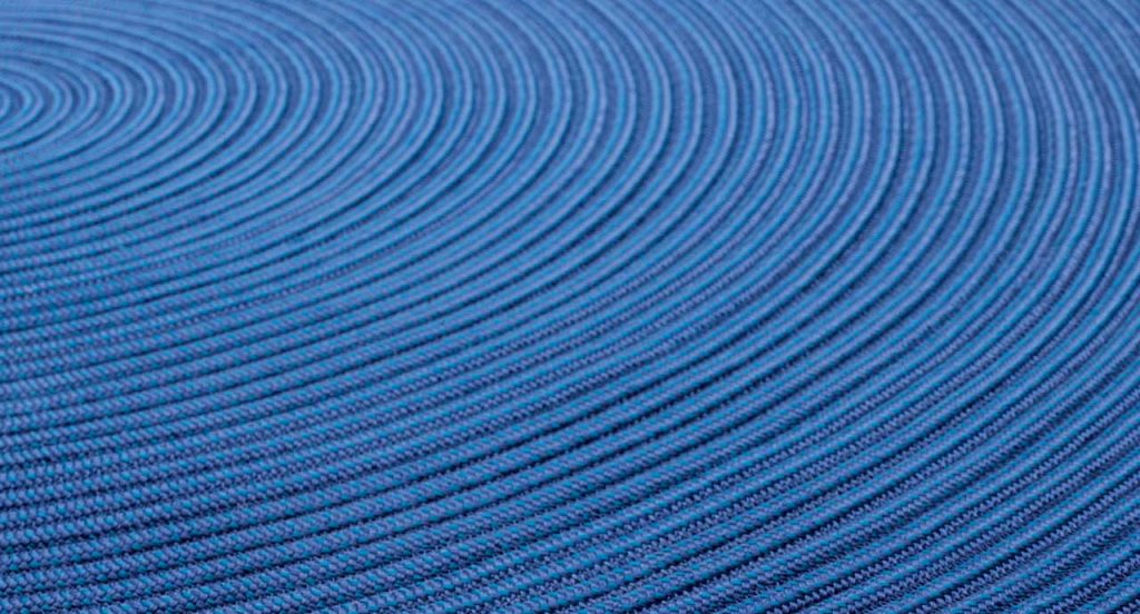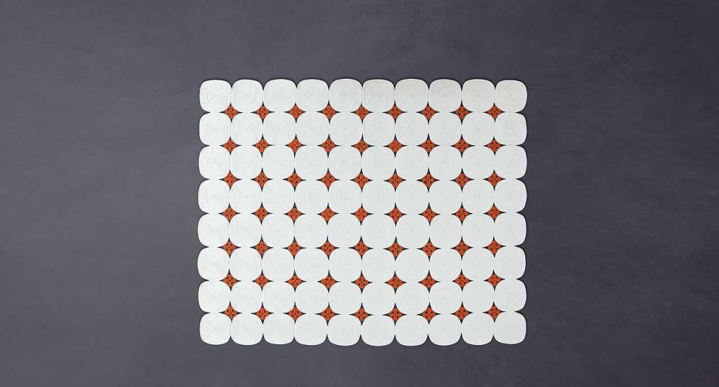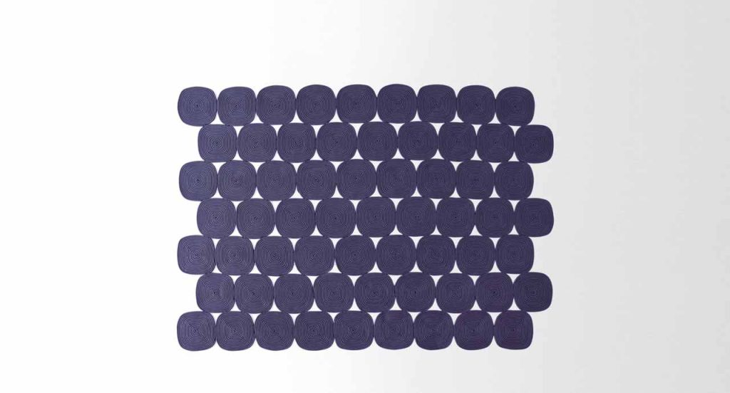 This rug for exterior and interior environments is created with one- or two-colour cords sewn in a spiral-like pattern in a predetermined sequence. The rug is produced with different cords, all falling within the chosen colour hue. It is possible to choose three related colour hues for the rugs background and two contrasting ones for the graphic sign, which is the featuring characteristic of this rug.